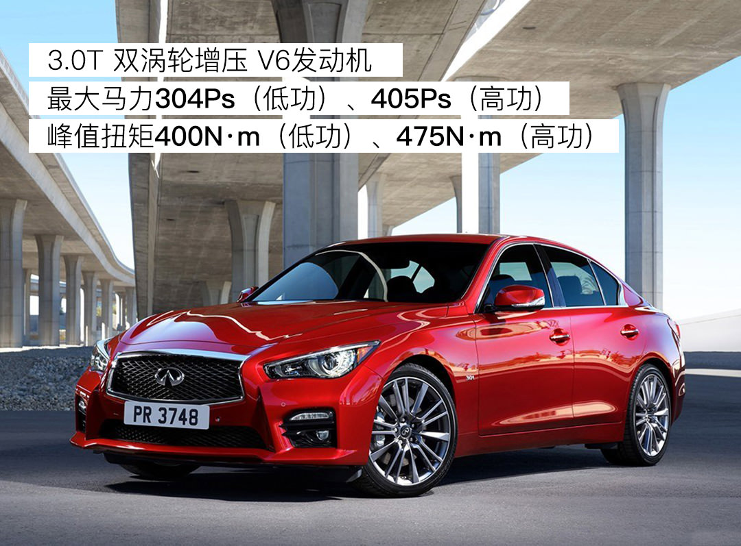 海外现款Q50供2.0T、3.0T发动机可选,其中前者与国内2.0T+7AT(戴姆勒集团提供)组合别无二致,后者则是由日产全新研发的3.0L 双涡轮增压发动机,分高低功率两个版本,分别配备单个、两个水冷式中冷器,其中高功率版本还配备光学式涡轮增压器,响应速度更快,燃效亦得到提升。
