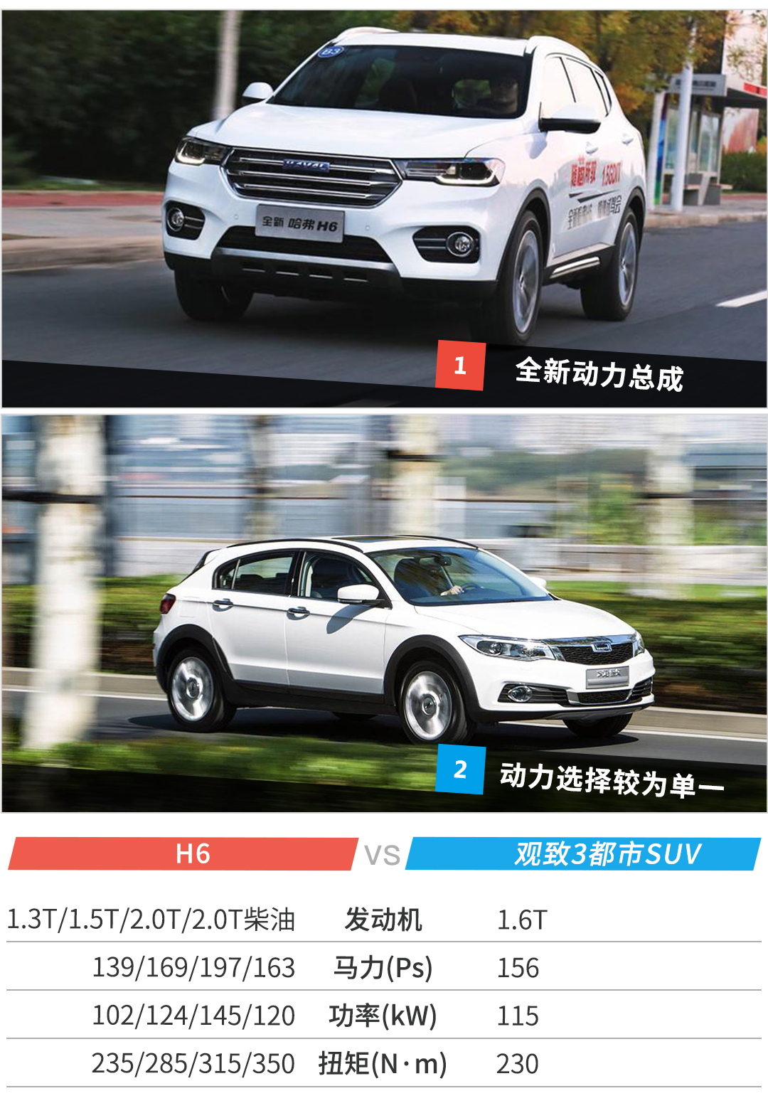 而在动力方面,观致3 都市SUV搭载了一台1.6T涡轮增压发动机,与之匹配的是一台6挡双离合变速箱,经过数年来的调校验证,已经有了比较大的进步;而对于哈弗H6却提供了1.3T、1.5T、2.0T三款动力供消费者选择,其中1.5T版本为主打车型。