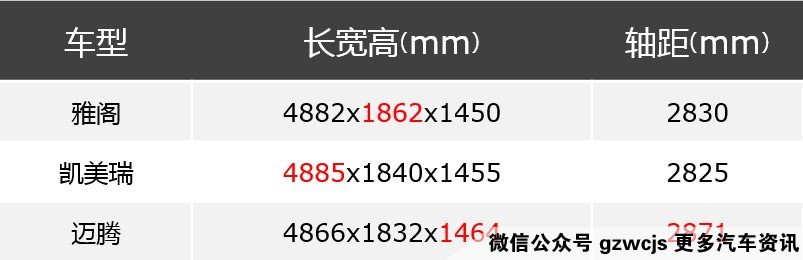 从车身尺寸来看,雅阁与凯美瑞、迈腾都在处于同一水平,但是在同级别竞品中,雅阁车身更矮更宽更加扁平,有助于提升运动感。