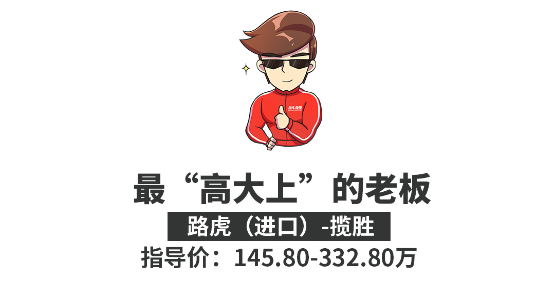 与其说开霸道(普拉多)的老板真霸气,还不如说开揽胜的人才是真正的“霸道总裁”,说到高大上,纵观市面上所有高端中大型SUV,好像真没几款能媲美路虎揽胜的了。也有人说路虎揽胜根本没有直接的竞争对手,因为在公路和越野的性能都如此卓越,内饰如此豪华,外观如此霸气的SUV屈指可数。