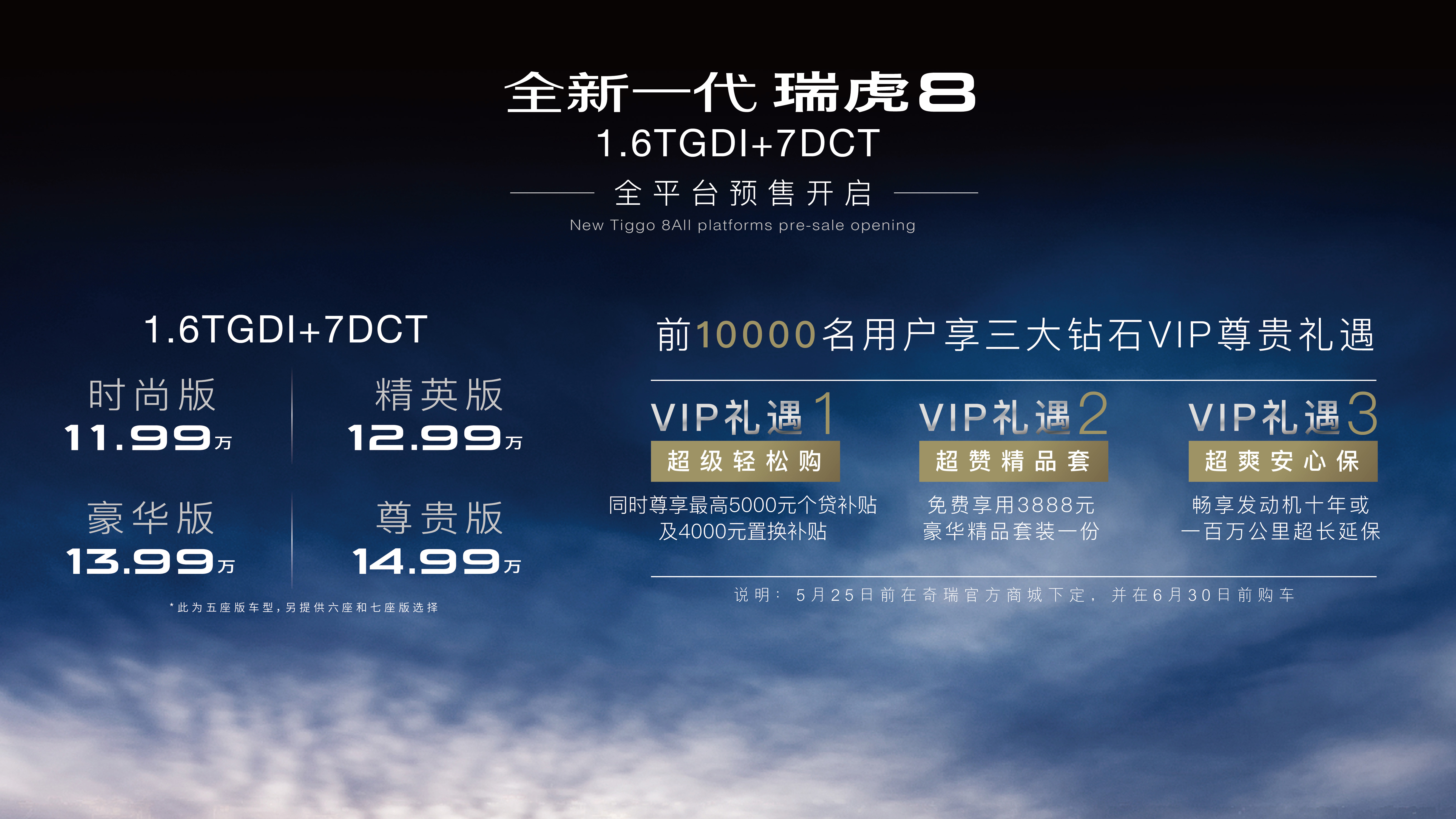 作为奇瑞SUV家族中的明星车型,本次亮相的全新一代瑞虎8搭载1.6T+7DCT动力系统全平台预售共4个版型,包括时尚版、精英版、豪华版以及尊贵版四款,分别有珍珠白、曜石黑、钛金灰、大漠金、莱茵蓝、普罗旺斯紫共6种车身颜色供用户选择。同时,预售期间所有订车客户均可享受三大钻石VIP尊贵礼遇:凡在5月25日前在奇瑞官方商城下定,并于6月30日前购车的前10000名用户可尊享最高5000元个贷补贴及4000元置换补贴、免费享受3888元豪华精品套装一份、畅享10年或一百万公里超长延保三重大礼。