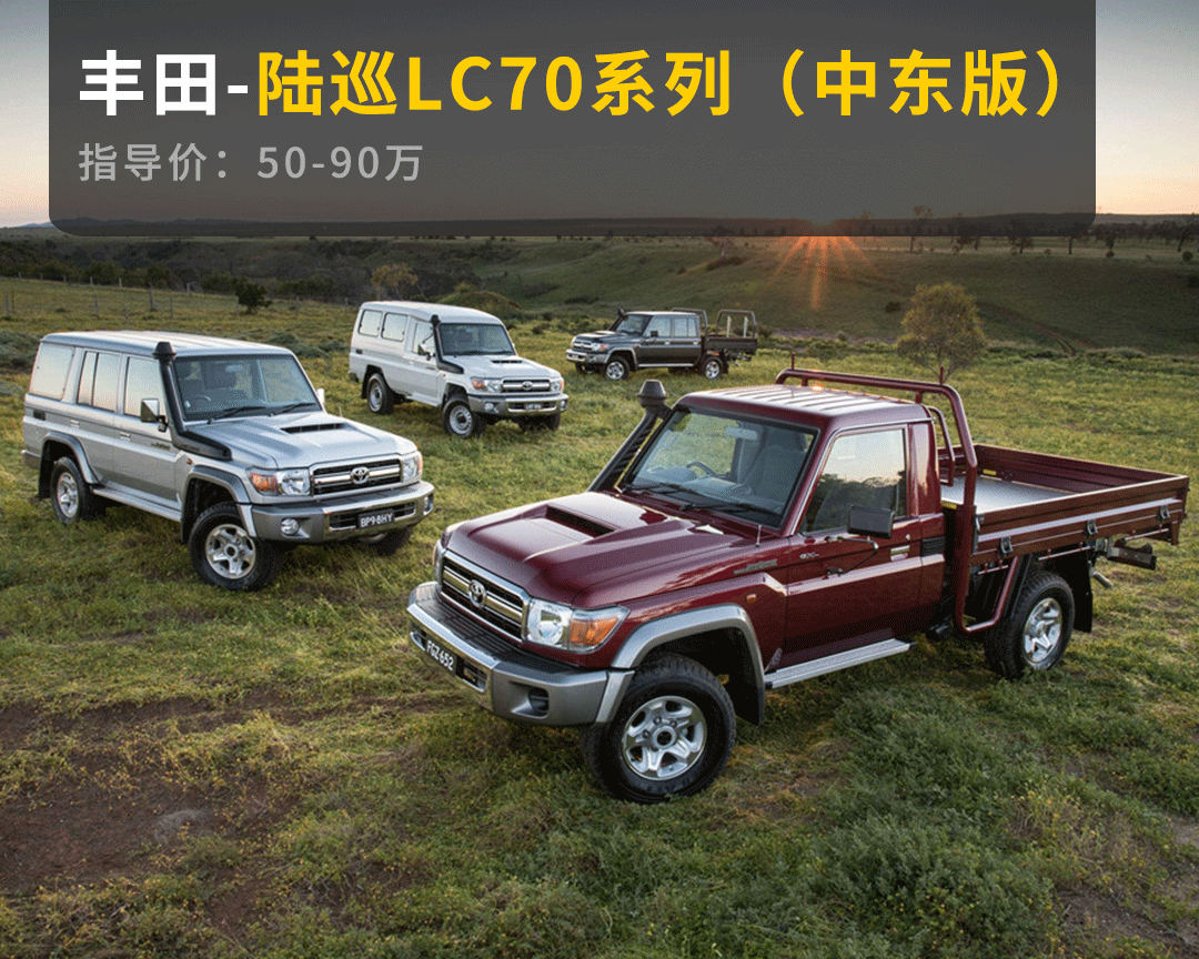 LC70系列也是陆巡,不过他是当今陆巡L200和霸道LC150车系的祖师爷,从1984年至今一直生产,从未间断,主要是为了满足亚非拉地区对廉价工具越野车的旺盛需求,毕竟LC70车系原始简单的车身结构在可靠耐用型方面有着先天的优势,因而越野个性玩家们也因此沾了福。外观让人一看到就很有非洲大草原观光车和军用吉普车的复古feel有木有!高配车型还自带涉水器,前后双差速锁,绞盘和外挂备用油箱等各种原厂越野配置,根本不用改装就可以直接去越野穿越了。