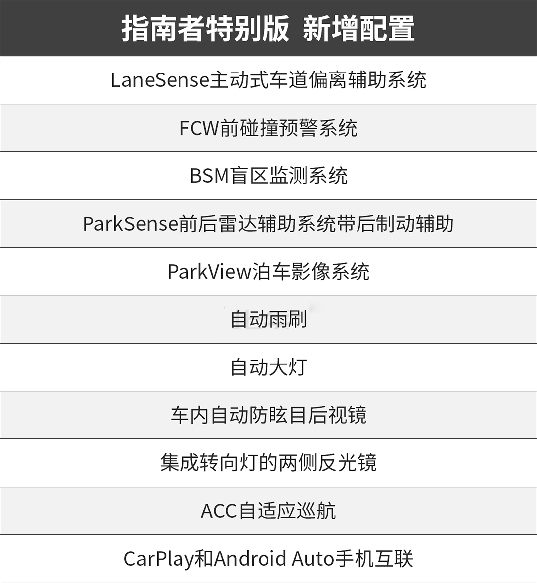 这次全新车型的发布,重点是对配置上的大幅增配,诸如ACC自适应巡航、自动大灯、泊车影像等配置的增加能辅助驾驶员轻松驾驶,而CarPlay、Android Auto手机互联等舒适性配置可以进一步提升车内便利性。这一版车型又名为安全特别版,车道偏离辅助系统、前碰撞预警系统、盲区检测系统等主动安全配置能让乘员安全得到最大程度的保证。搭载了如此多科技配置的指南者虽然看起来很不吉普,但为了进一步适配城市工况和消费者需求,它显然足够厚道。