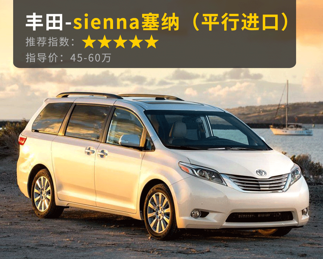 推荐理由:平行进口身份的塞纳貌似小众,但其实它在国内非常受欢迎,保有量在同级MPV中一点也不算小。塞纳在北美是一辆8座车(当然在中国只能坐7人),满载状态下的后备箱空间甚至比别克GL8还要大,而且塞纳搭载了3.5自吸V6引擎,动力澎湃,还可以选装四驱,各种配置版本的车款也是应有尽有任君选择,最重要的,还是继承了丰田一贯变态的可靠性。不过,3.5的排量还是让塞纳的油耗有些高,如果2.0T的塞纳能快点国产就好了。虽然如此,但鉴于如此强大的产品力,塞纳还是能获五星推荐。