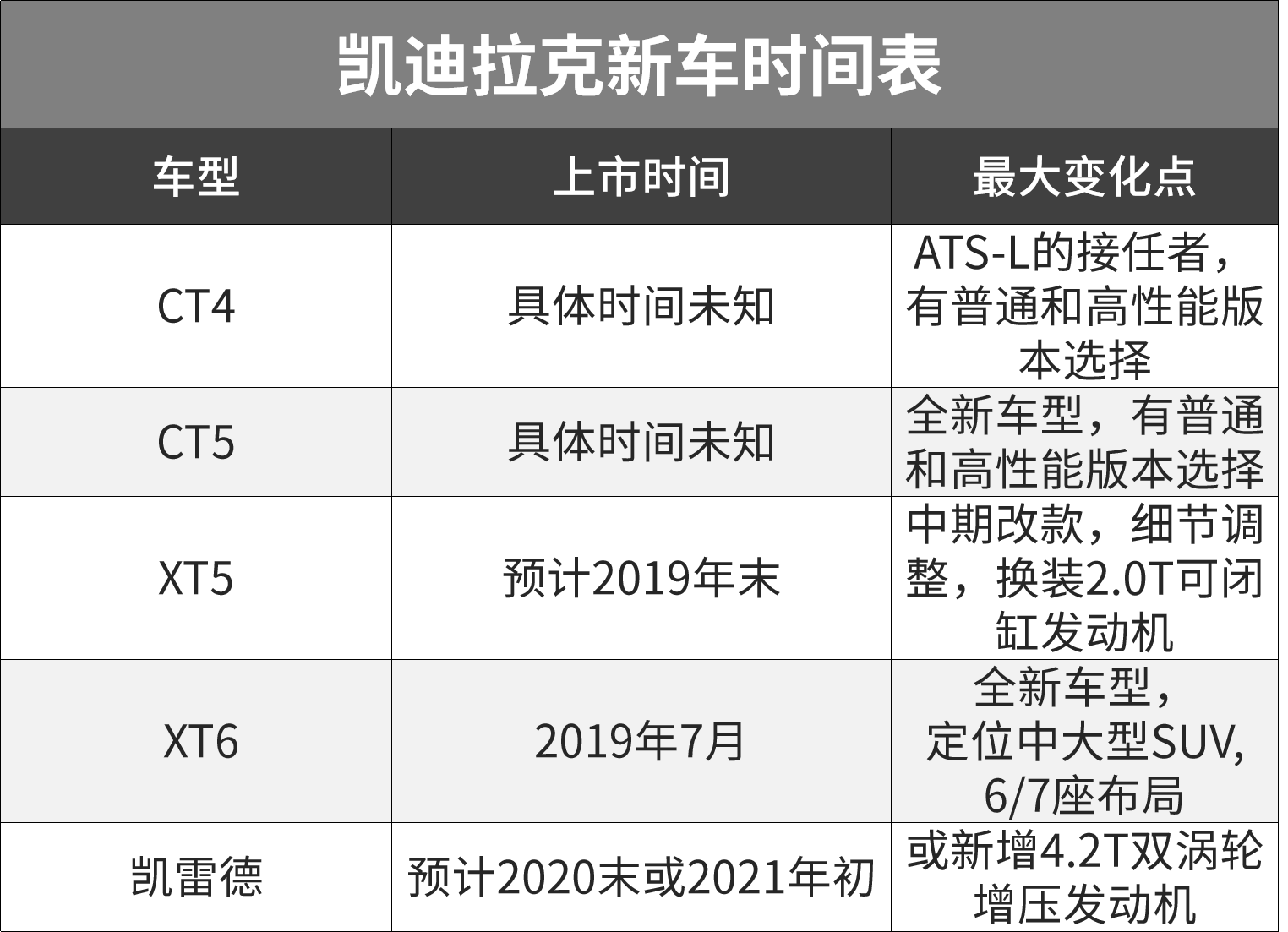 在有了XT4和CT6新车型的补充之后,凯迪拉克并未停止新车阵营完善的步伐。在接下来的时间内,正迎来产品大变革之际。从入门轿车到全尺寸SUV,凯迪拉克多款新车正整装待发。