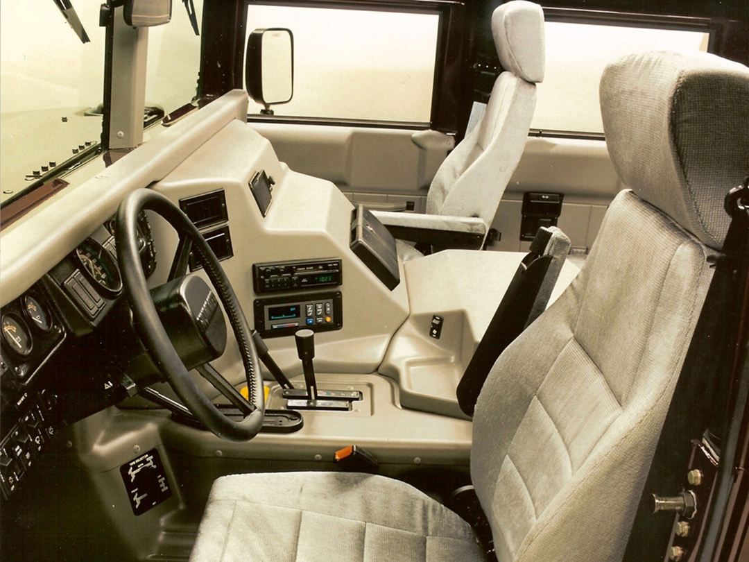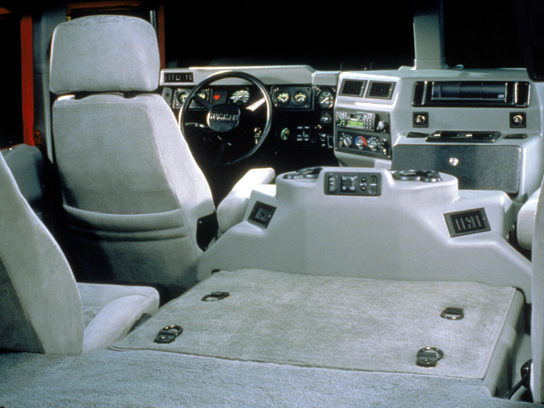 于是,负责生产制造HMMWV的AM General决定推出民用版本,准备进攻普通消费市场。于是在1992年,HMMWV的民用版本:Hummer(悍马)诞生了,首款车型被命名为H1。这款硬派越野车几乎完全保留了HMMWV的外形设计,在机械性能部分也延续了军用版的中置引擎布局、前后双A臂独立悬挂、内置充放气功能轮胎等设计,因此在越野性能方面与军用版本相当接近。
