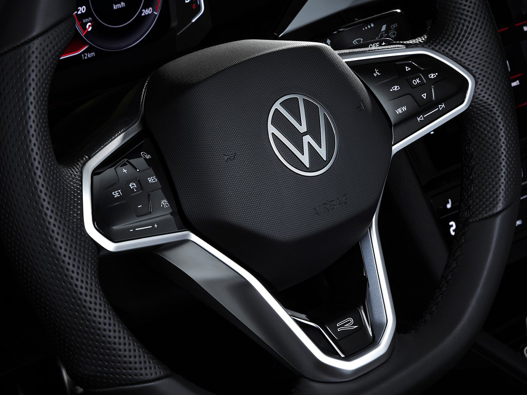此外,方向盘也使用了大众集团最新的设计,扁平化的logo运用在方向盘上,同时两侧多功能按键也使用钢琴烤漆以及一体化设计,不会像以前一样通过按键精细分开功能区域,而且取消掉了原来的按键,转而使用虚拟触控形式,虽然能够在你“按下”按键时给你一定的回馈,但是你并不能按下按钮,初次使用可能需要适应一下。R系列车型在方向盘上会使用蓝色装饰条,增强车辆的氛围。