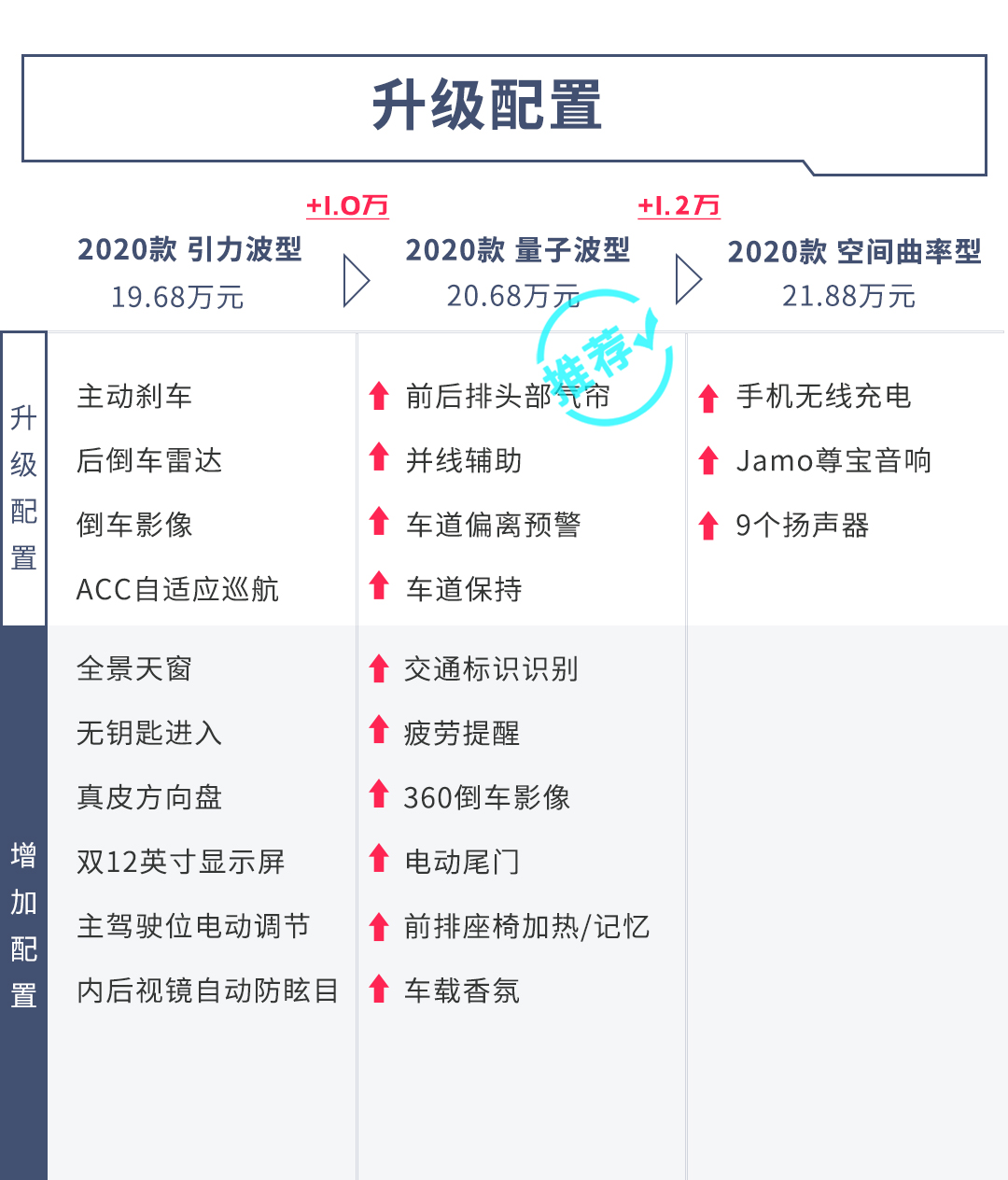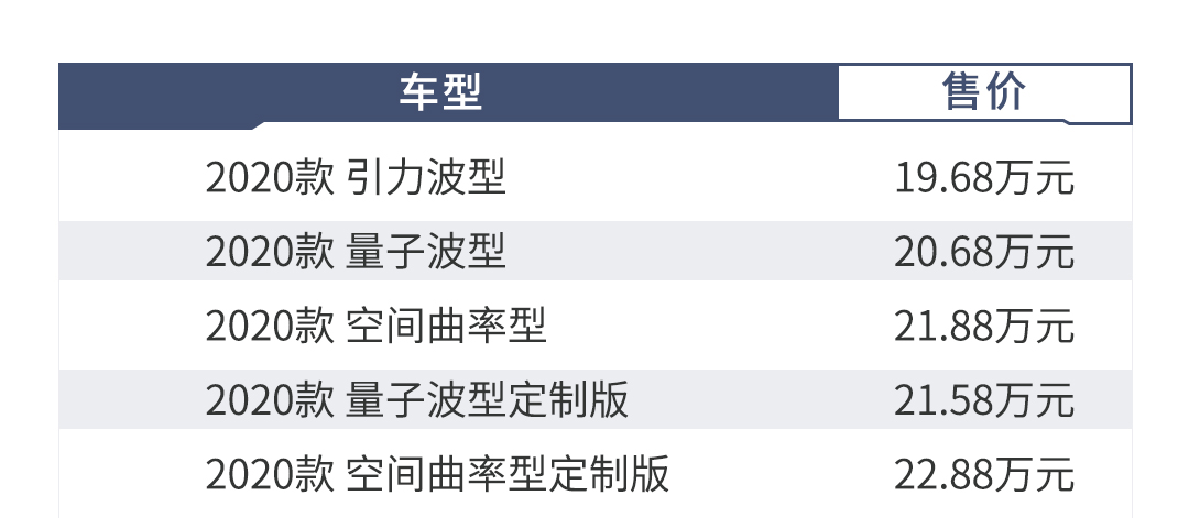 撇开两款定制版车型不谈,在三款基础配置车型上20.68万的量子波型比较值得购买,在引力波型的基础上多了自动辅助驾驶和一些便利性配置,例如360倒车影像和电动尾门等,这些配置在日常中非常实用。