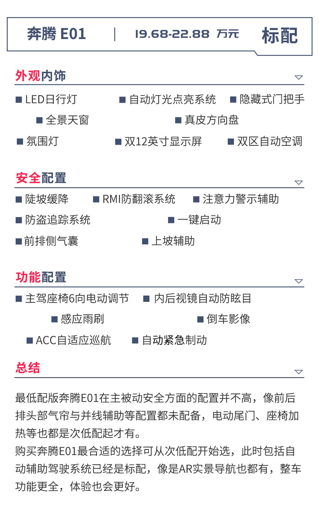 另外,次低配的奔腾E01已经搭载了驾驶辅助系统,能够实现并线辅助、车道偏离预警和交通标识识别等功能,这正好是竞品所不具备的,所以,想要长续航还是自动辅助驾驶系统,取决于消费者购车时用车需求的侧重点了。