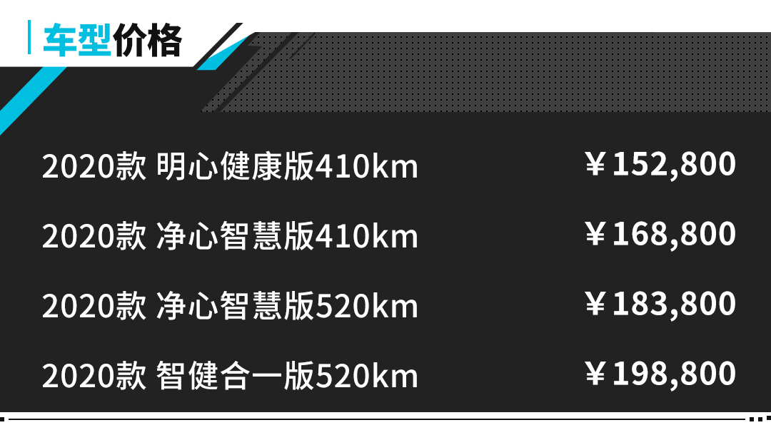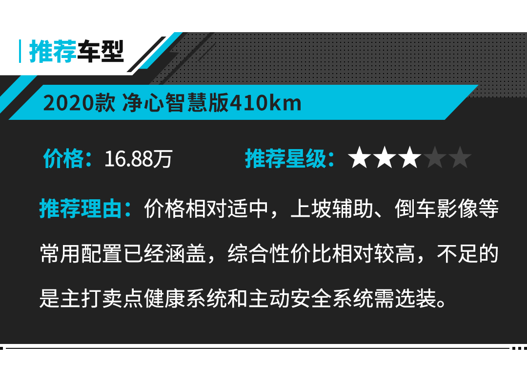车型推荐层面,教授个人觉得,2020款净心智慧版410km车型,各方面综合性价比高。首先价格相对比较适中,然后410km的续航里程满足日常的市内通行已足矣。