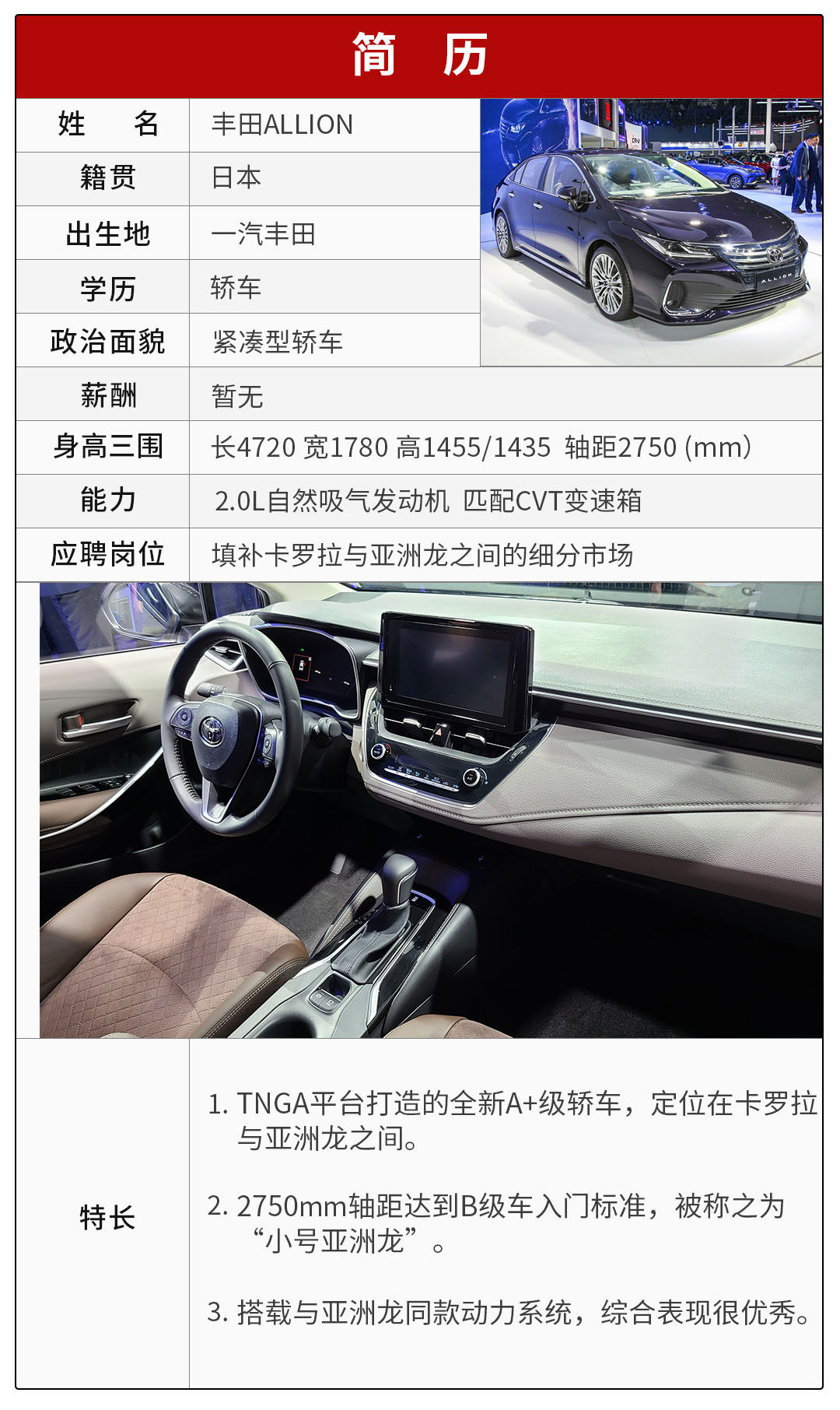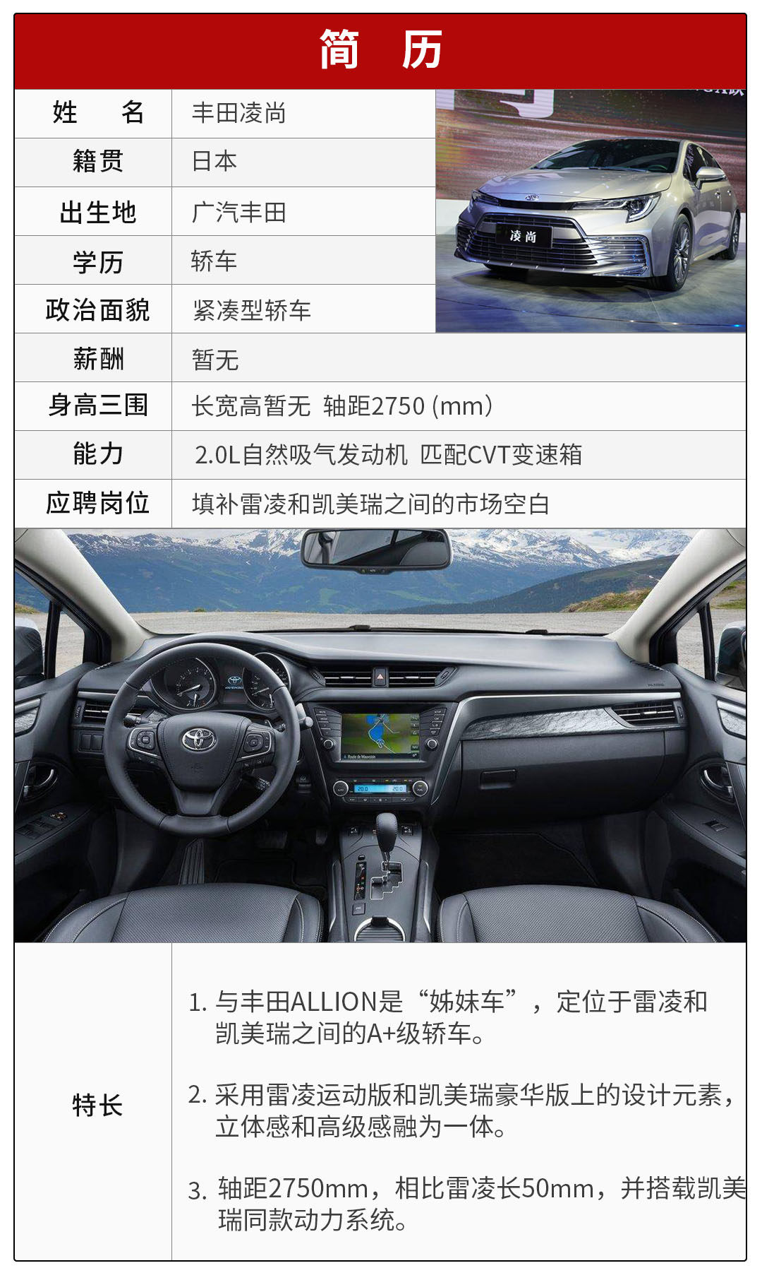我和ALLION一样,都是来自丰田的TNGA架构,相同的发动机、变速箱以及底盘结构,要说不同之处,那唯有是车内外的设计以及配置了。我的整体造型风格与雷凌运动版较为相似,但定位高于雷凌,有着更大的空间,相比凯美瑞将有着更低的售价,主打性价比市场。总的来说,我集豪华、运动以及舒适为一身,喜欢运动风的朋友选我准没错!