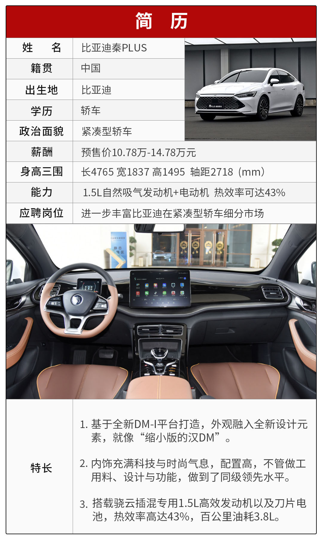 我是比亚迪彻头彻尾的全新车型,这次来就是为了展示咱们王朝的品牌实力,一方面是我优秀的节能表现,另一方面就是我科技性的优越感。我不仅有着全新DM-i平台还有骁云插混专用的1.5L高效发动机和刀片电池,加上高颜值的外观内饰设计,我有信心能让比亚迪在轿车领域取到很好的成绩。