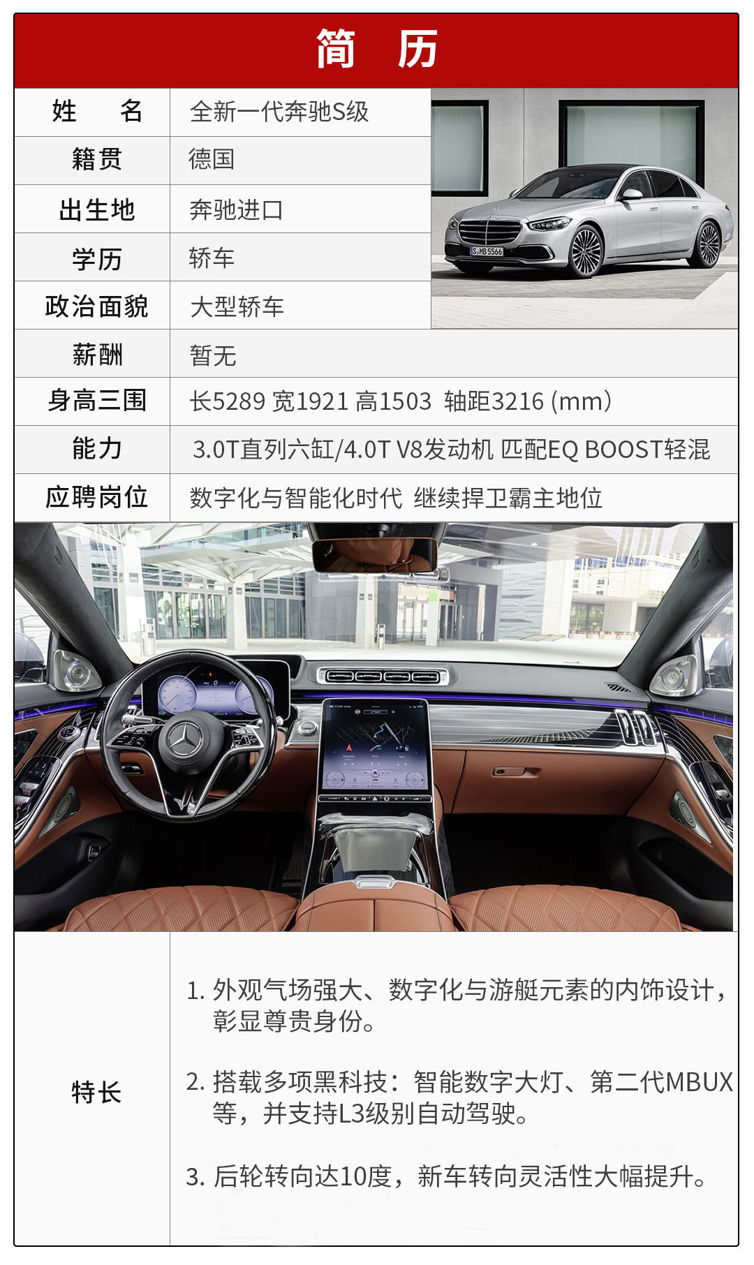 从外观到内饰再到科技,我确实给大家带来了不少惊喜。或许我不如现款S级那样的优雅、奢华,但我相信高科技、高智能才是未来豪华轿车的主流。全新一代我的到来,就是为了给大型豪华轿车定下一个全新的科技标杆,不仅有着独有的气场,还有高智能高科技装备来引领这一时代的潮流。