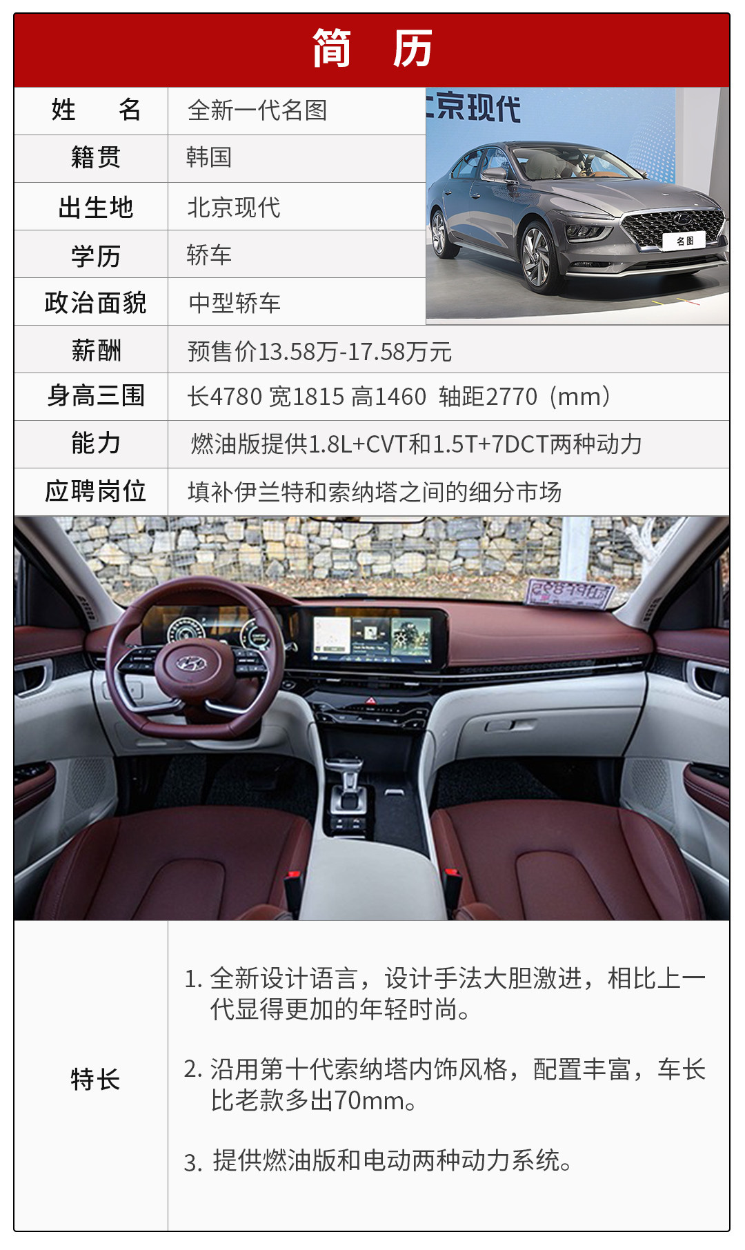 作为专为中国打造的合资中型车,我自2013年上市以来就累计销售了75万辆,绝对称得上是北京现代的主力车型。如今我迎来了全新换代,顺应消费者需求,继续主打高性价比,毕竟我的车内用料、科技配置以及后独立悬架系统等细节表现比同级别大多数车型都要出色。而我会将于今年第一季度内上市,要是上市价格与预售价相差不大,那么我可能就是你们能买到的最便宜的合资中型轿车了。