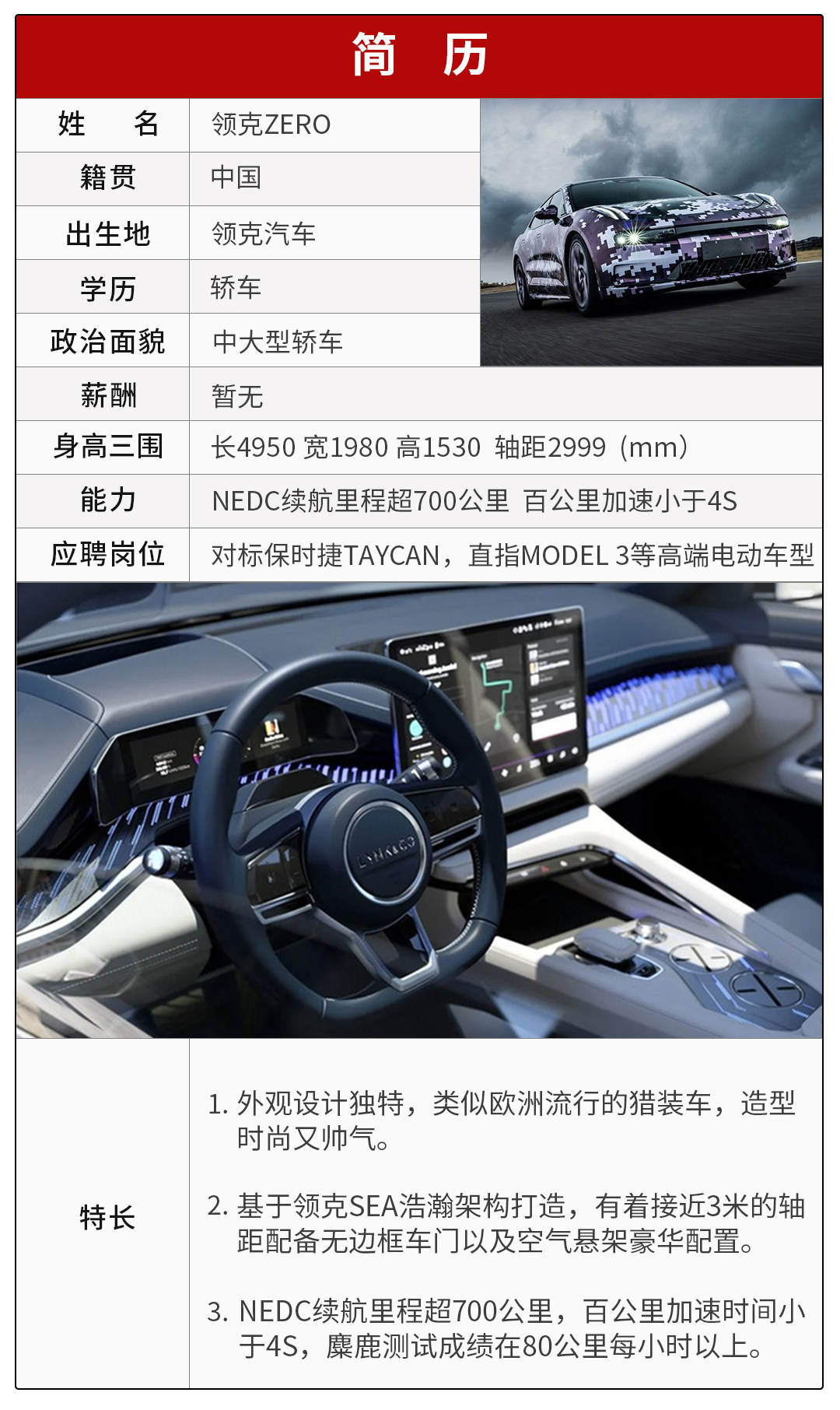 我是为了冲击中高端新能源市场而来,定位略低于极星2,基于领克全新SEA浩瀚架构打造。有着50::50的车身比例,接近3米的轴距以及4950mm的车身长度,加上无框自动电吸门的应用,我能很好的兼顾空间和美感。值得一提的是,我的麋鹿测试超过80km/h,百公里加速3.9S,直指MODEL 3、小鹏P7以及比亚迪汉一众热门纯电动车型。那么我未来的市场售价会有不少惊喜,拭目以待吧!