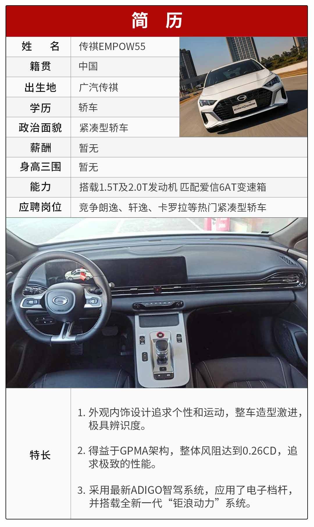 我基于广汽传祺GPMA架构打造的首款运动轿车,整车改变非常大,如果遮住车标,你可能会看到奥迪A7的影子。而且我将会推出专为赛车爱好者准备的特别版,更贴合当下年轻人的需求。当然,我的到来还标志着广汽传祺进入了全新的平台化、模块化造车时代,未来的GPMA架构还会推出SUV、MPV、PHEV等车型。