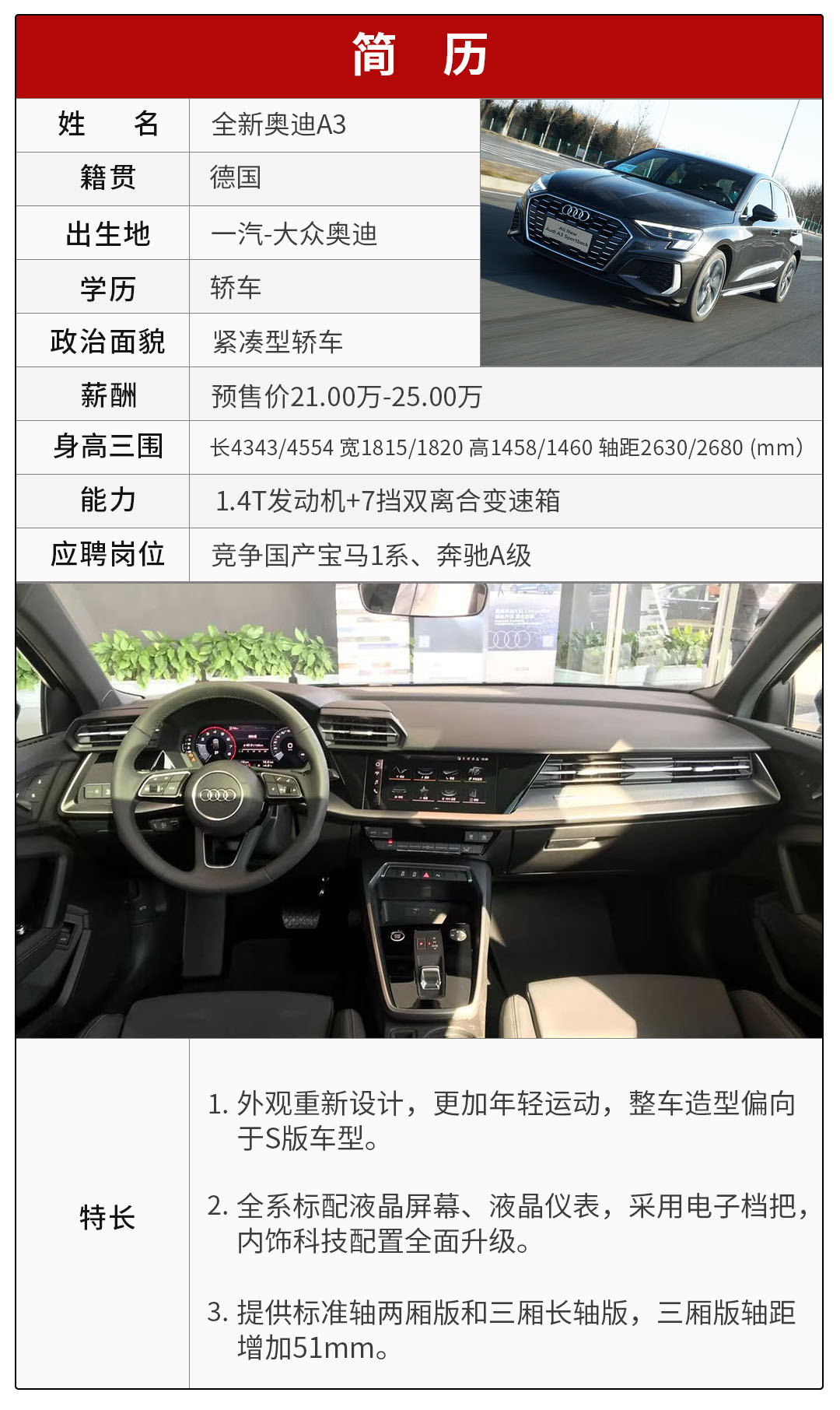在2020年,我卖出了76912辆,依然站在了豪华紧凑级轿车市场的榜首。而今全新换代的我经过全新升级,可谓诚意满满。相比现款车型,更年轻的形象、更智能科技化的配置加上三厢轴距加长,面对老对手宝马1系、奔驰A级优势就更加明显了。另外,距离我上市的时间没几天了,你们准备好掏腰包了吗?