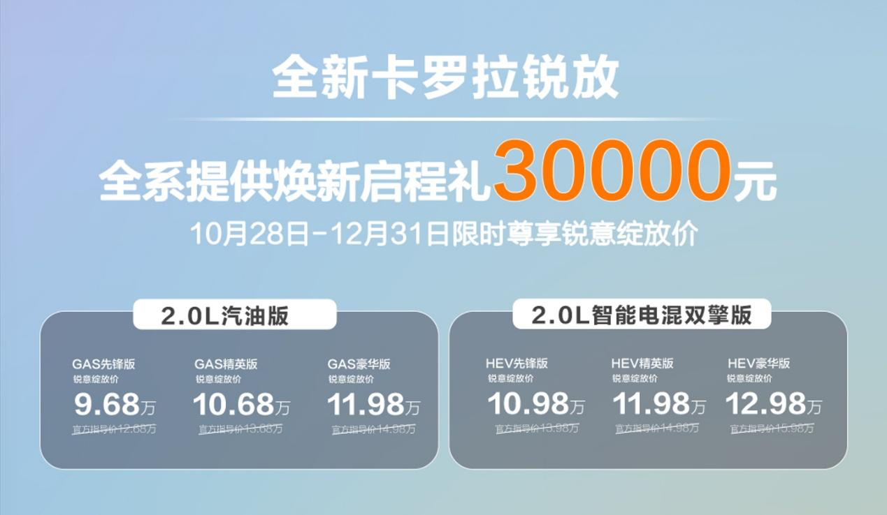 全新卡罗拉锐放价格体系极具竞争力,配合“焕新启程礼30000元”限时权益,进一步降低购车门槛。