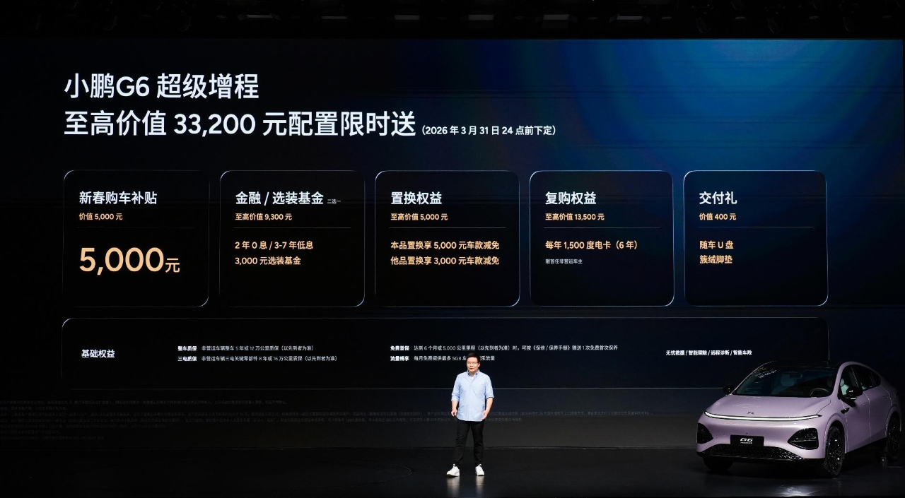 2026年3月6日,广州)今日,小鹏汽车举行小鹏G6超级增程上市发布会,新车定位六项全能AI增程SUV,以“六项全能 一步到位”为核心,凭借同级综合续航第一、同级补能速度第一、同级车端有效算力第一、同级最强底盘系统、同级最强主动安全和同级得房率第一的六大核心优势,打造真正满足用户全场景需求的国民车。本次发布小鹏G6超级增程1704 Max,官方指导价为18.68万元,用户可选装两个智能升级包,加购12,000元升级为Ultra SE版本、加购20,000元升级为Ultra版本。即日起至2026年3月31日24点前下定小鹏G6超级增程,可享至高价值33,200元限时权益礼包,包括5,000元新春购车补贴、至高价值9,300元金融/选装基金(二选一)、至高价值5,000元置换权益、至高价值13,500元复购权益和价值400元交付礼。