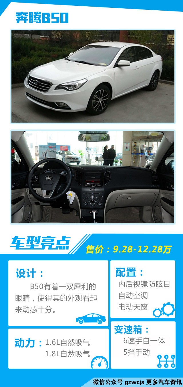 点评:奔腾B50的外观看上去十分年轻与运动,1.8L自然吸气的发动机也在一定程度上弥补了1.6L自然吸气发动机的动力不足的缺陷。高配车型有着非常丰富的配置,再加上给力的售价和优惠,使得奔腾B50有着很高的性价比。
