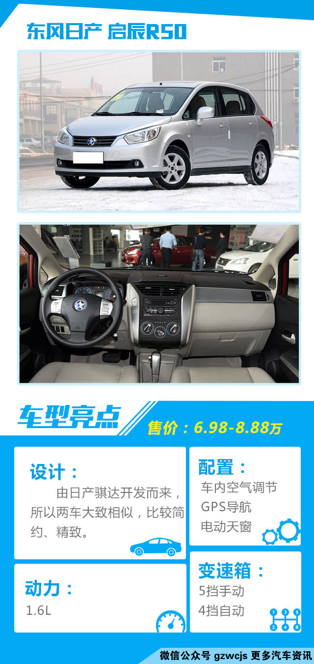 点评:启辰R50以老骐达为蓝本开发而来,所以看上去有些日产骐达的影子,而不仅是外观内饰上的大致相同,启辰R50也搭载了日产的整套动力系统,所以在技术上是没有问题的,在质量上也有保障,属于技术稳定成熟的“合资自主”车型之一。