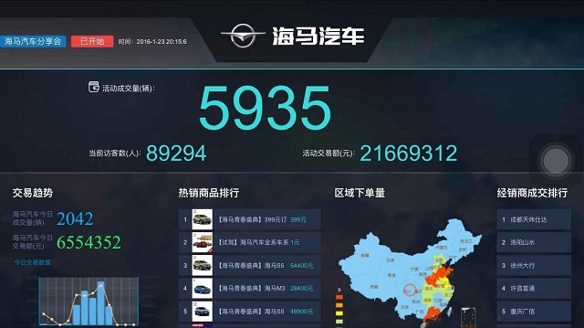 不仅如此,海马汽车携手天猫商城推出的“智·享无限 海马汽车2016年度青春盛典”也在深圳现场公布了实时订单数据和线上支付金额。突破5900台的有效订单量,代表海马汽车传统线下终端和线上电商平台的对接成熟度达到了中国品牌领先水准。