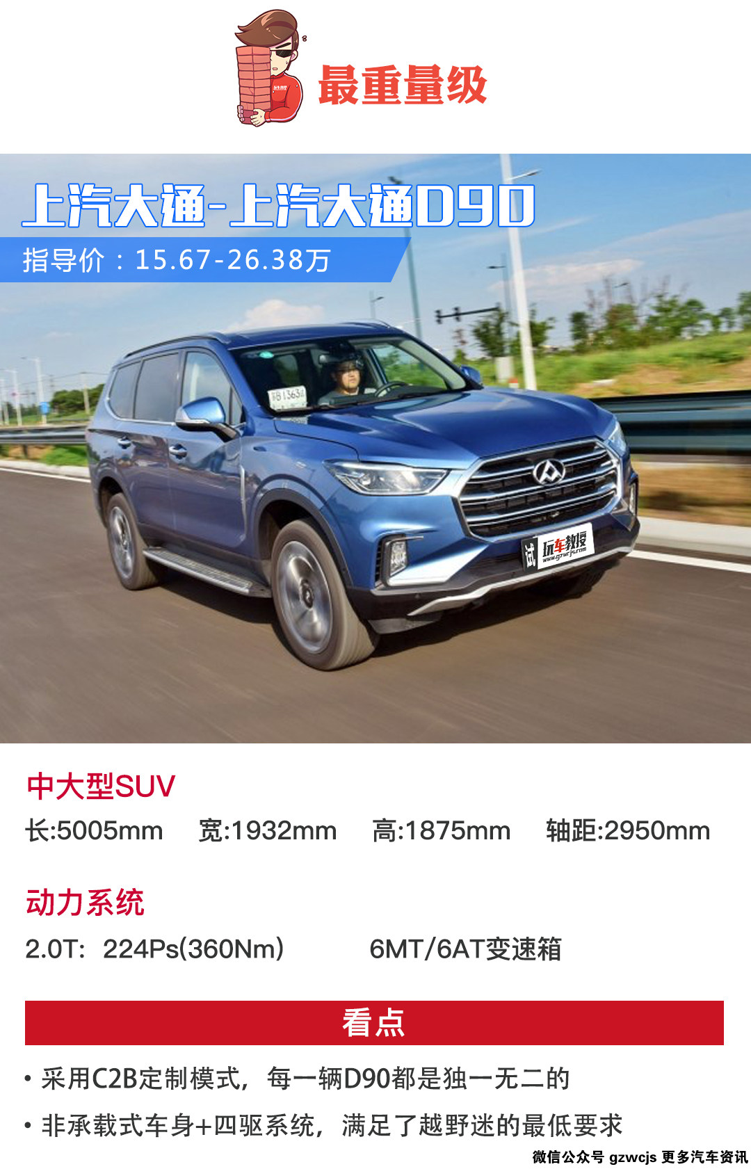 大通D90在8月8日就已经上市了,只是最近教授在成都车展看到了这款车,确实被TA的超大外形震撼到。售价是15.67-26.38万元,对于一款2.0T、非承载式车身的中大型SUV来说,这个价格还是很合理的。只是全系配备了2.0T的发动机,对于一辆2.3吨自重的车来说,动力的表现是有限的,所以大通D90的“最重量级”不仅表现在外形上,还将会体现在动力表现。