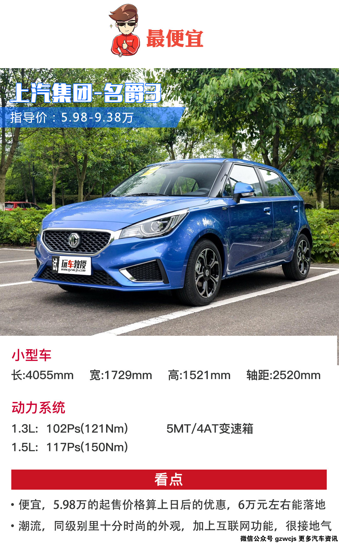 第一眼看见名爵3的时候,你脑海里很可能会跳出另外一辆车-长安铃木雨燕。全新的名爵3搭载了1.3L和1.5L两款发动机,马力相对老款有明显的提升,同时自动变速箱也加入了4AT,再配合上5.98-9.38万元的超低售价和车联网这一卖点,对于年轻消费者来说吸引还是颇大的。只是1.5L的车型没有手动挡的低配版本确实有点可惜。