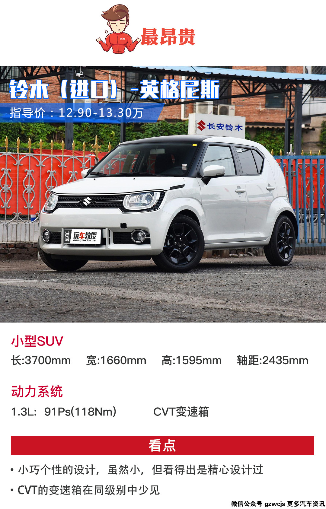 一辆和铃木奥拓大小差不多,底盘稍高一点,搭载一个1.2L发动机,唯一拿得出手的可能就是CVT变速箱,这样一款“小型SUV”要价12.9万。你肯定会说:铃木疯了吧?然而,这辆进口的小型SUV确实买这个价钱,也亲身静态体验过这辆车,后排的座椅虽然憋屈但也是可以坐人的,空间没毛病,只是内饰的做工和用料还是有比较强的廉价感,至于装配粗糙就依然是老问题了。仅从静态看,完全不值这个价钱,所以我说它是“最昂贵”的,以后试驾看看开起来怎样吧。