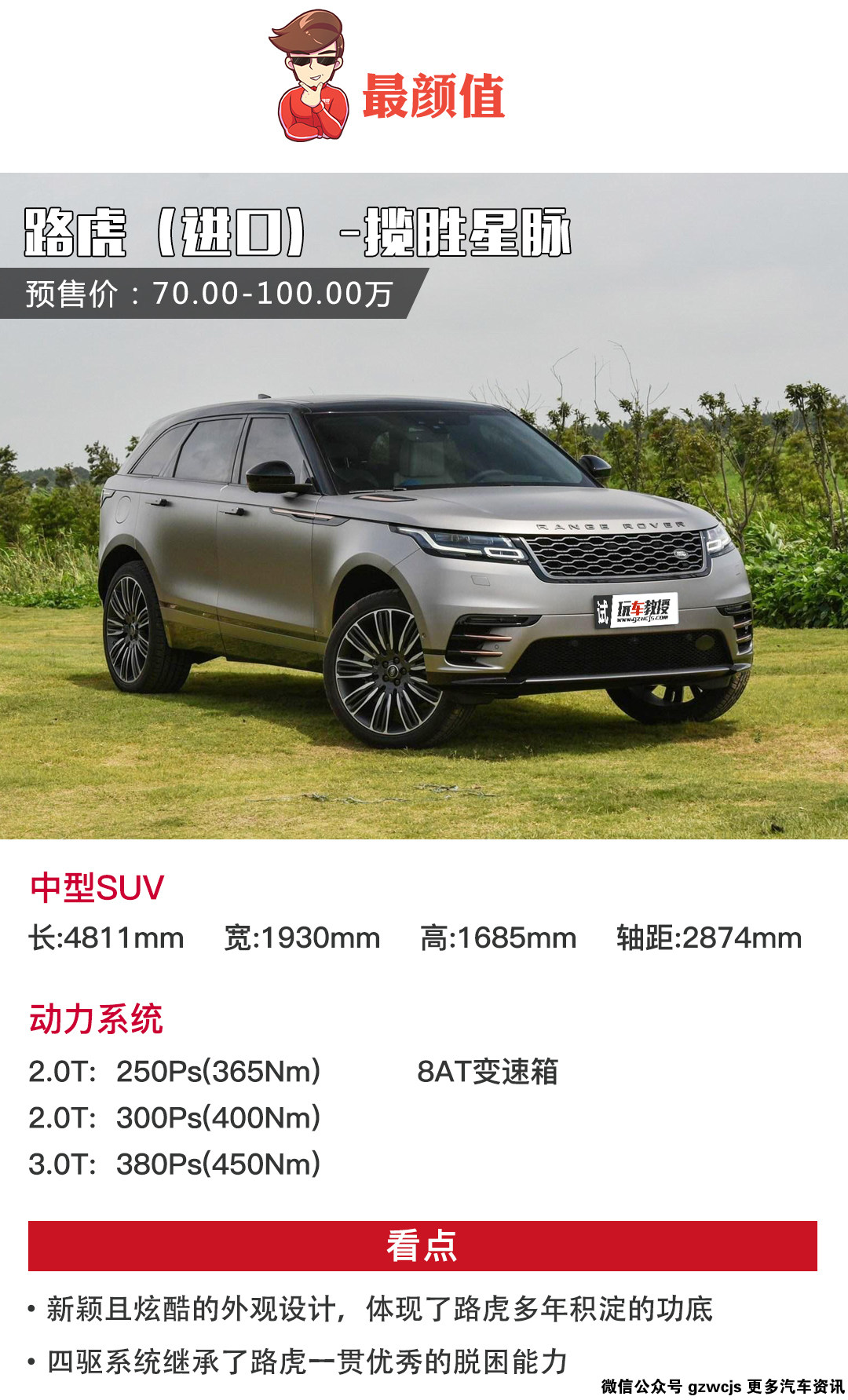 说路虎星脉是最高颜值应该不会有异议吧?短前悬长后悬的修长车身、隐藏的门把手、熏黑的车顶、略带Coupe感觉的车尾,对了,还有内饰,黑白色的内装、双触屏的中控台,豪华感科技感都比以往的路虎有过之而无不及。不说性能如何,仅仅是这些设计的心思,就已经值得我们掏腰包。这款车的预售价是70-100万元,具体价格会在9月2日公布,可以关注一下。
