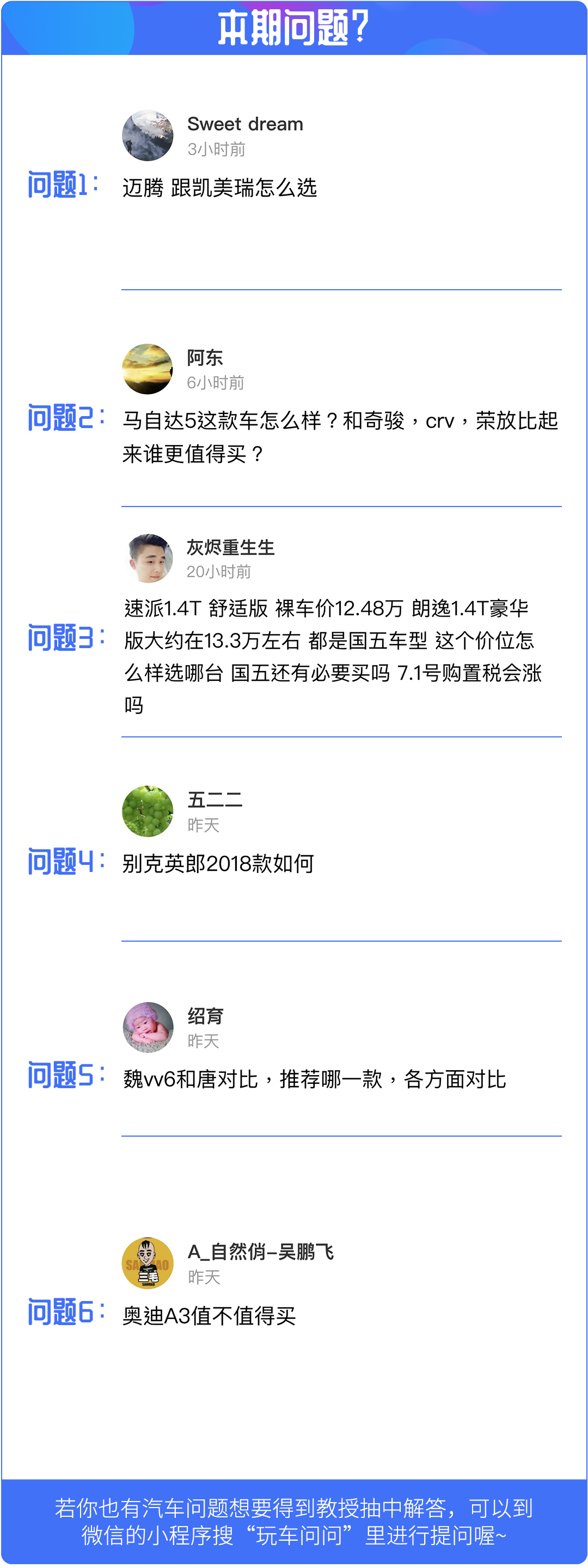 在网友问答栏目中教授将会在小程序-玩车问问里挑选6个问题进行回复,如果对购车、用车有什么疑问的话,欢迎点击下方玩车问问小程序,有许许多多非常厉害的技师为你解答喔!