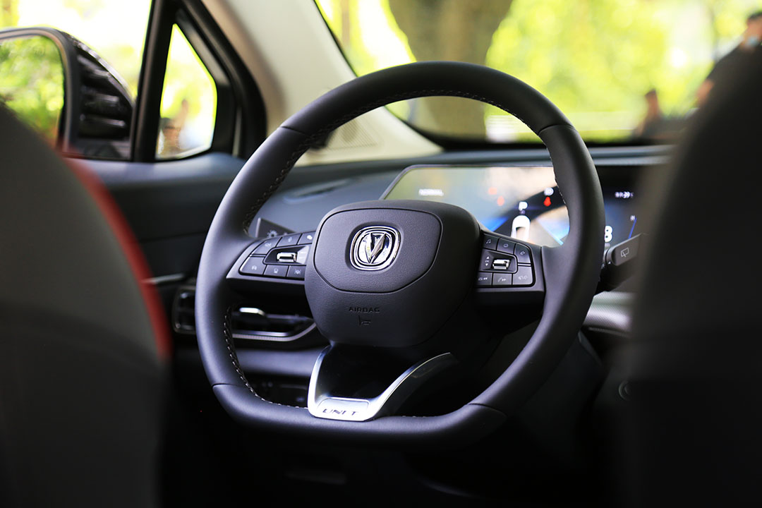 多功能方向盘可以在行车过程中进行音量调节、切换驾驶信息等操作,平底式的设计增添了不错的运动感,与UNI-T的动感气息相契合。方向盘握感适中,转向力度柔和,对于车辆能够很轻易的把控。
