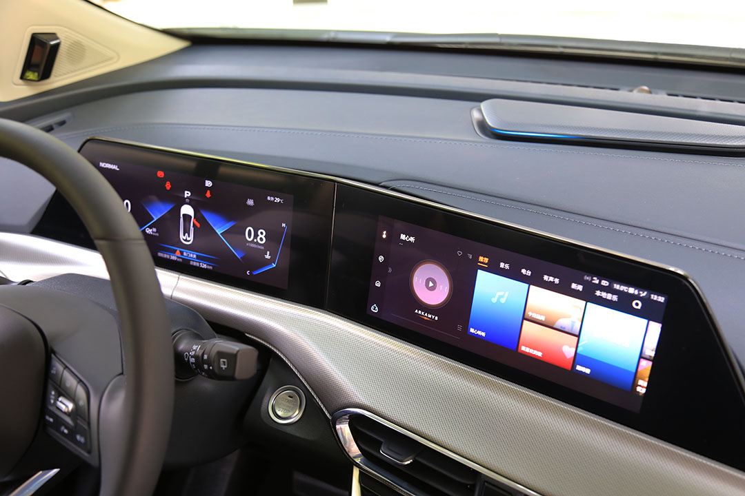 UNI-T采用一体式双 10.25 英寸 屏幕,分辨力达到了1920*720P ,UI界面、功能、流畅度都做得不错,光线自适应功能使得这两块屏幕即便是在阳光比较强烈的时候,也可以看得一清二楚。同时中控屏以 8.1°夹角略微倾向主驾驶位,能够提升驾驶员的阅读体验。