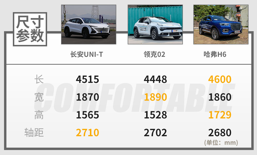 尺寸方面,与同级别相比,长安UNI-T在轴距方面的优势比较明显,作为一款紧凑型SUV轴距达到了2710mm,因此车内空间相对有保证。
