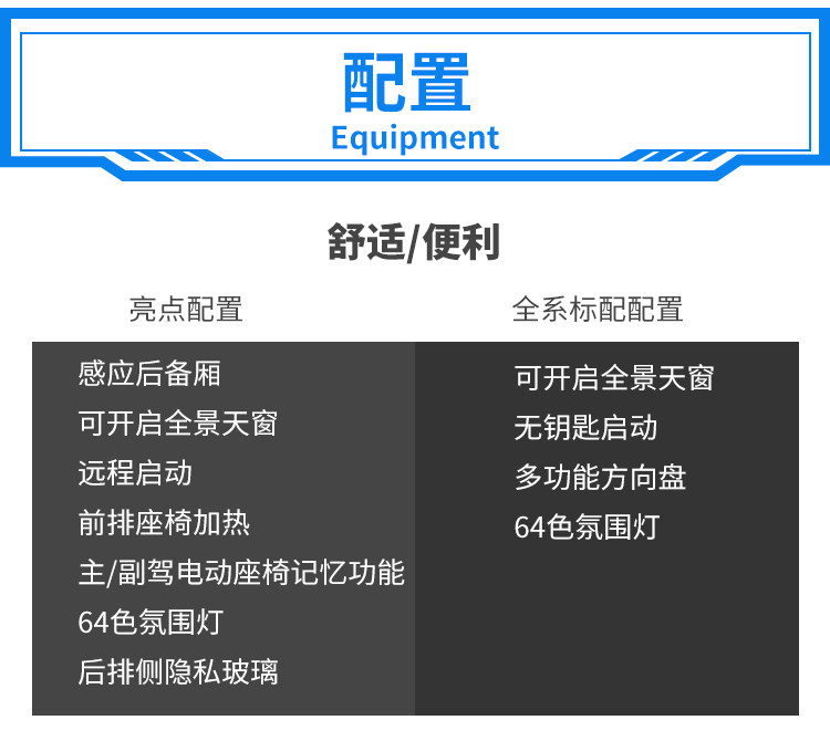 配置方面的亮点主要集中在舒适、便利配置方面,诸如64色氛围灯,后排侧隐私玻璃等,都在一定程度上提升了用车体验。