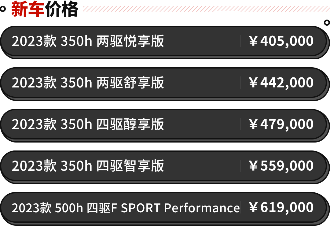 没错,即便是最便宜的RX350h两驱悦享版,也已经成为了一款搭载着丰田混合动力系统的混动车型。具体的动力系统上,RX350h配备2.5L混动系统,最大功率184kW(250Ps),RX450h+ 使用的是2.5L 插电混合动力系统,系统综合功率为 227kW(309Ps),CLTC 纯电续航里程为 83km,RX500h 则配备 2.4T 混动系统,系统综合功率 273kW(371Ps)。