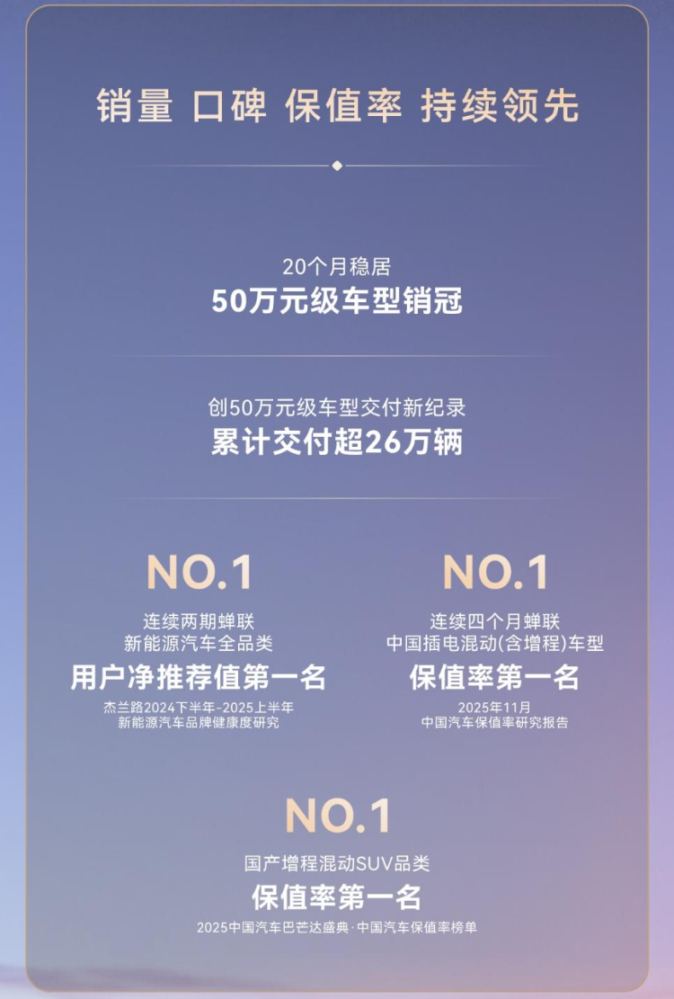 除了销量与交付量持续攀升,问界M9更以净推荐值、保值率双第一的成绩,稳坐豪华汽车市场标杆席位。在中国汽车流通协会发布的《2025年11月中国汽车保值率研究报告》中,问界M9已连续四个月蝉联中国插电混动(含增程)车型保值率第一,并在2025中国汽车巴芒达盛典“中国汽车保值率榜单”中位列国产增程混动SUV第一,展现50万级豪华车价值新高度。在杰兰路2024下半年-2025上半年新能源汽车品牌健康度研究中,问界M9连续两期获得新能源全车型用户净推荐值第一。此外,在中国质量协会发布的2025年中国新能源汽车行业用户满意度指数评测结果中,问界M9荣获第一名,并在J.D. Power 魅力指数榜单中位列豪华插电混动SUV第一……这一系列殊荣,共同印证了这款现象级产品在新能源豪华车市场的标杆实力。
