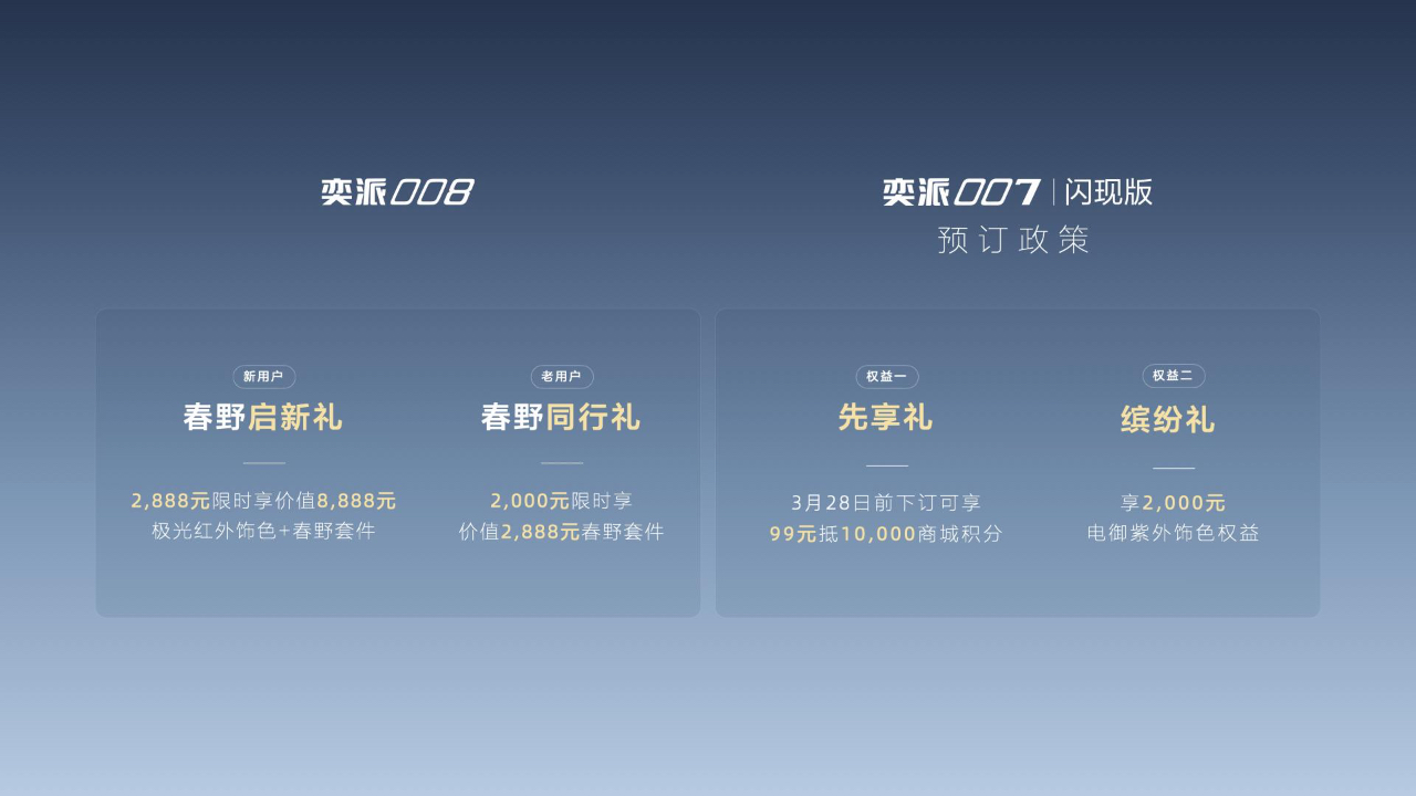 适配家庭百变出行场景的“大舒适家”奕派008,始终致力满足中国主流家庭对高品质出行的多元想象,正式推出用户共创全新车色——“极光红”。新车色以红色极光为灵感,经过多次车漆调校,兼具奢雅通透的视觉质感与升级耐磨的漆面工艺,实现美学与品质双重进阶。为进一步提升家庭出行的舒适与便捷,奕派 008 推出涵盖车顶横杆行李架、固定侧踏板、放电插排三大核心配置的“春野套件”,并同步释放双重限时购车权益:新用户下订极光红外饰色绑定春野套件限时先享价2888元;老用户可在APP下订春野套件,限时回馈价2000元,助力用户轻松开启春日美好出行。