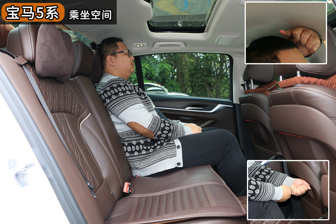 老板坐进5系后排,腿部有两拳的空间。以座椅舒适度来说,老板认为宝马5系的是最舒服的。座椅比较宽大,而且还向E级学习加入了一个软头枕。而且5系也是本次横评的车型中,唯一有后排靠背电控调节的。
