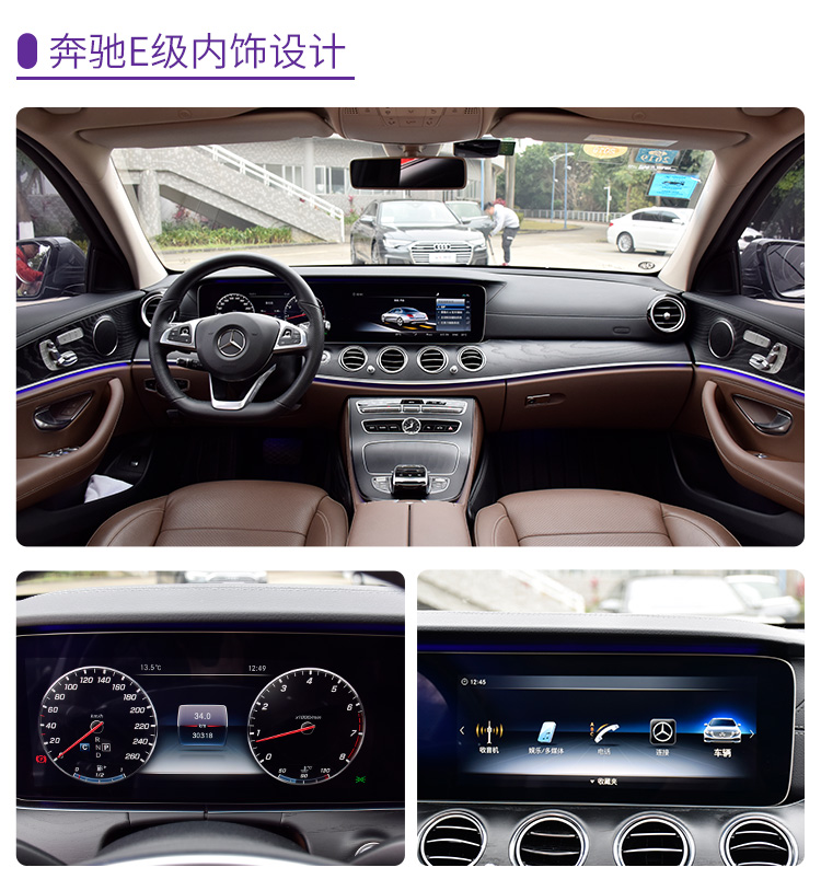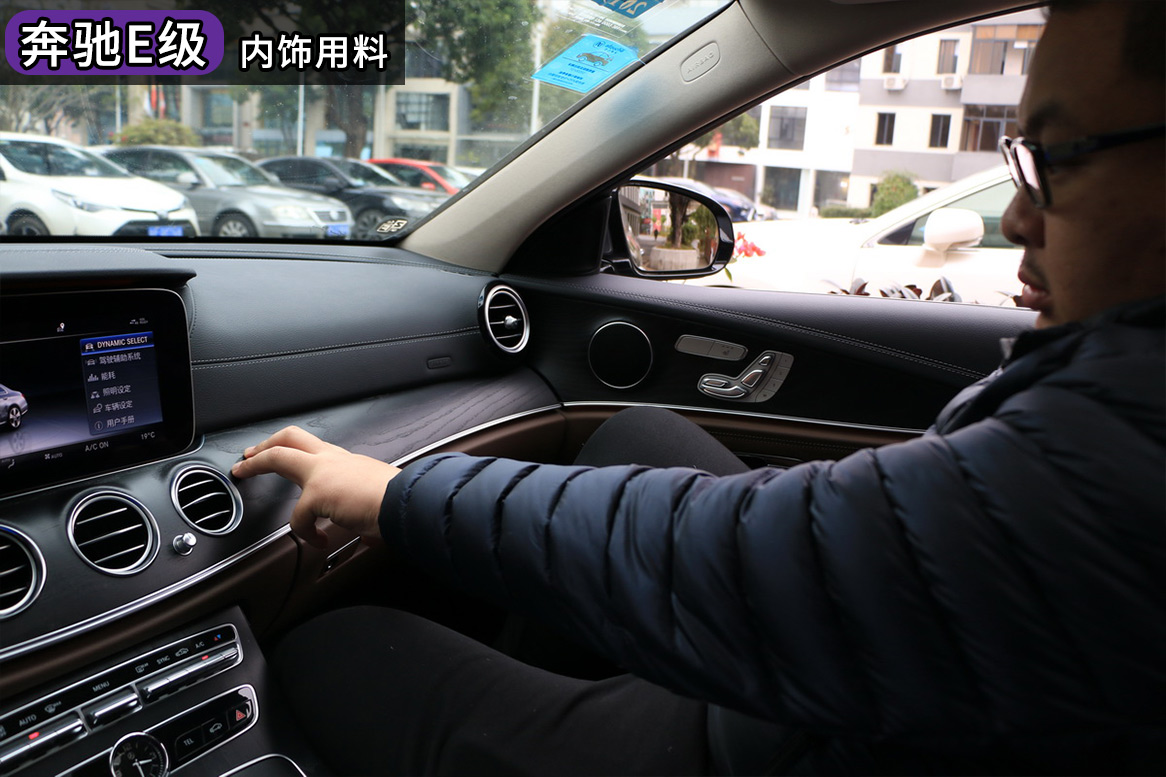 奔驰E级的内饰比较传统优雅。中控台的设计用了一条优雅的曲线贯连起来,就像一条波浪。E级的用料也无可挑剔,金属质感的出风口,按键以及木纹和真皮材质的中控面板。老板表示非常喜欢这种风格。