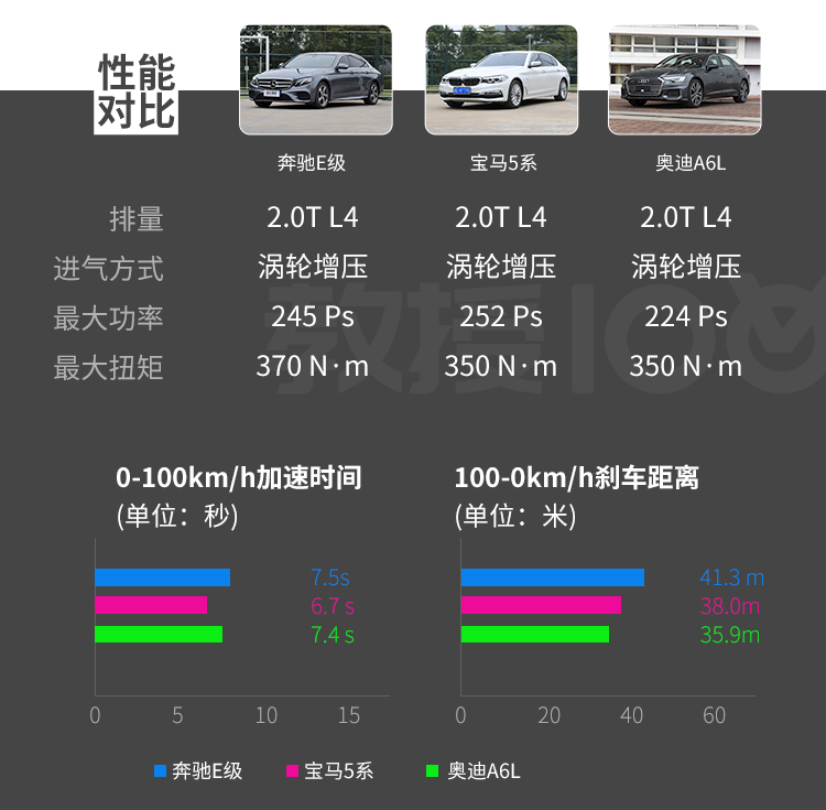 三款车加速最快是宝马5系,刹车距离最短的是奥迪A6L。由于奔驰E级已经行驶了3万公里,所以刹车距离会较长,如果是新车状态下,三款车的刹车距离应该相差不大。