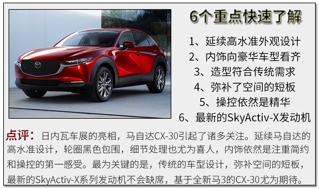 总结:综合之下,教授觉得马自达CX-30有几个明显的优势。首先是长久积累下来的的品牌操控魅力,这一点是很多品牌车型无法媲美的,尤其在小型SUV上。动力提供了3款动力系统,尤其是2.0L SKYACTIV发动机,GVC黑科技系统,操控更有信心。其次,是魂动设计之下设计理念,延续了高超的颜值水平的同时,传统SUV车型设计,又弥补了空间的短板。最后,内饰上将运动简约放在第一位的同时,在用料上向豪华品牌看齐,质感体验也是一大优势。引进国内之后,只要在价格进行一个把控的话,相信该款车型会比之前几款车型有较大的突破。