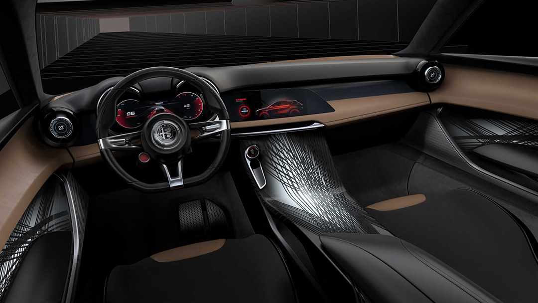其中前大灯尺寸变得更大,并且加入了灯罩,内部构造虽然无法清晰看见,但预计将会与概念车一样采用两侧各6个多边形光源的设计。而尾灯部分则基本维持了概念车的贯穿式设计,两端与前大灯一样采用单侧3个四边形光源,并以红色LED光带勾勒造型的设计。前后大灯的设计风格源自阿尔法罗密欧经典的159系列车型。