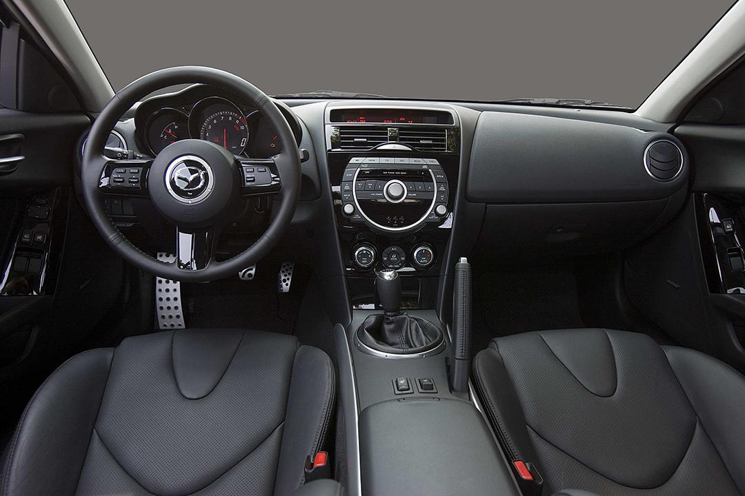 至于内饰上这款车型同样是非常简洁,不过相比起S2000还是多了不少配置的,在仪表盘上虽然没有S2000那样来得那么具有科技感,但是三桶式仪表盘在运动气息上丝毫不输,并且采用了跟法拉利相同的中置转速表,并且表底显示是10000转。RX-8与S2000一样分为前后期两个版本的车型,在两款车型上主要针对中控布局、方向盘、仪表盘作出了变化,以及采用了来自Recaro的左右,而图中所示的正是后期版车型。