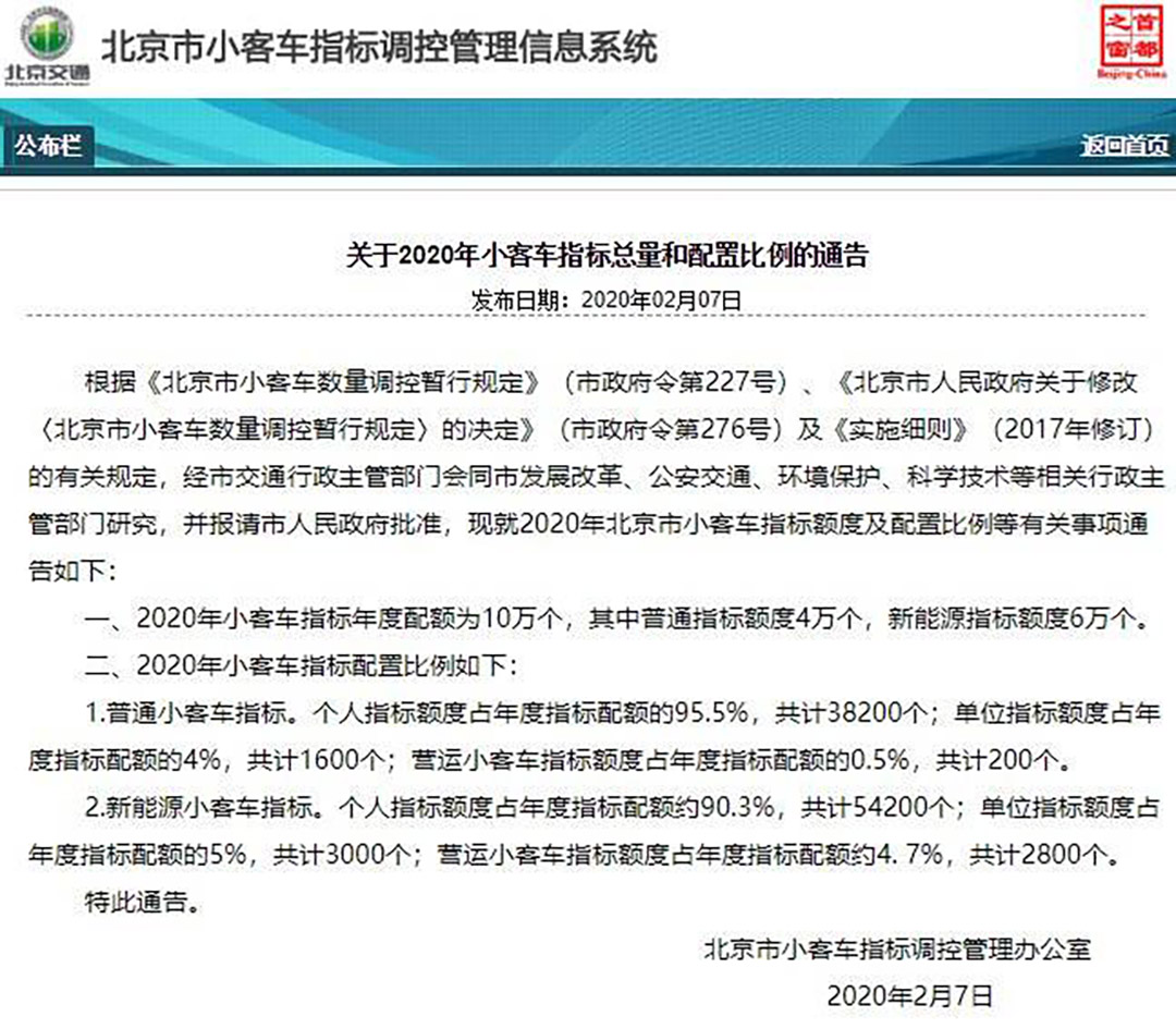 2月7日,北京市小客车指标办发布信息显示,2020年小客车指标年度配额为10万个,其中普通指标额度4万个,新能源指标额度6万个。10万个年度配额指标中,普通车个人指标额度占比95.5%,共计38200个;新能源个人指标额度占比为90.3%,共计54200个。据悉,今年个人指标额度相比于2019年普通车38000个,新能源54000个都略有增加。此外,在新能源购车指标方面,北京实行轮候配置政策,但按照往年的数据来看,北京每年有5.4万个新能源指标配置给个人,根据现有44.85万个申请指标有效编码,新申请者至少需要轮候9年才能得到新能源指标。