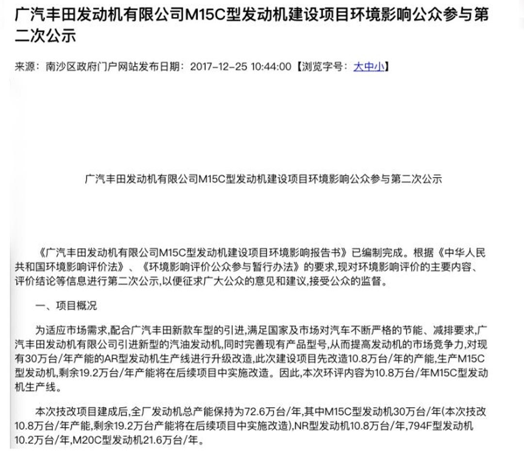 无独有偶,广汽丰田发动机有限公司也在2017年公布了生产M15C型发动机项目建设公示。