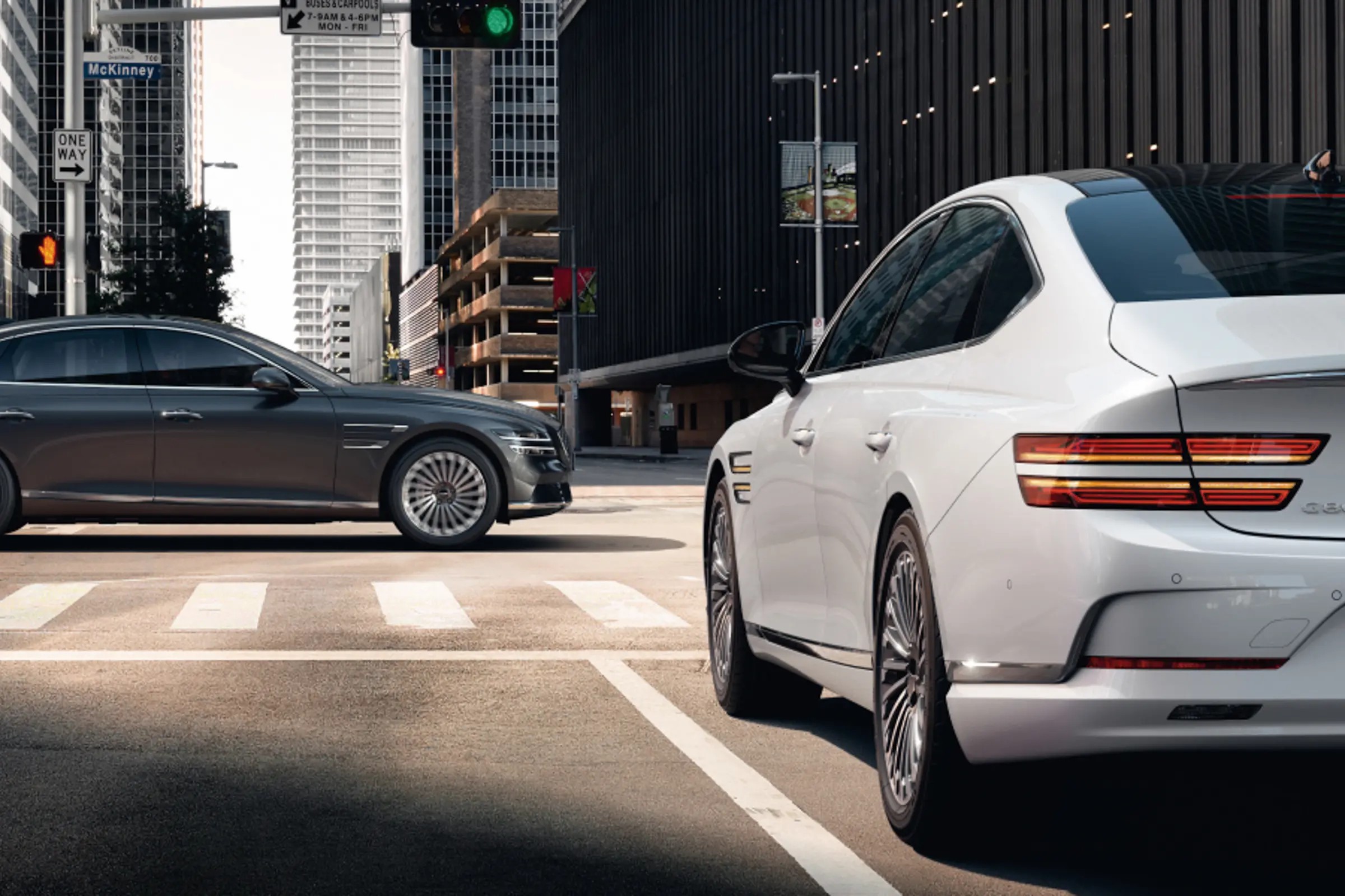 捷尼赛思G80上许多熟悉的设计元素也同样在捷尼赛思G80 EV有所保留,例如溜背式设计,标志性的平行线式LED前后灯组、大尺寸密辐式轮圈、尾部小尺寸扰流板以及各种亮色镀铬装饰件,且姿态也和燃油车型一样低矮,运动豪华氛围同样出色。