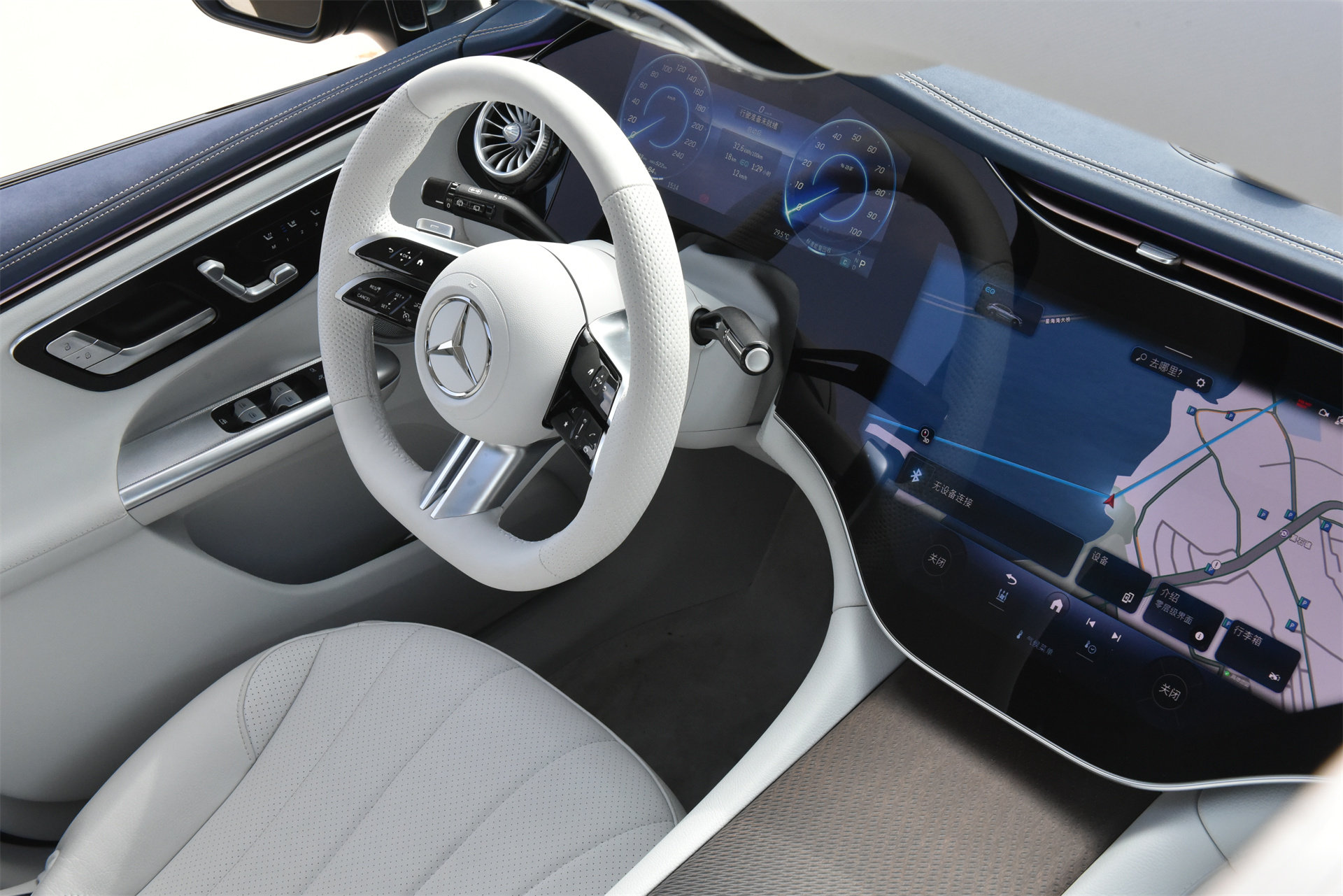 但我们同样也能看到,奔驰在很多细节上,仍然坚守着智能和机械的交点。首先,无论车机处于任何界面,处于任何功能下,中控屏下方的UI界面永远是固定的空调调节区(当然了,带震动反馈的),这个区域不会因为任何功能或APP而有所区别。换句话说,你可以把中控屏幕下方的这块特地往下设计的,专门只用于空调UI的区域,看作是一种“电子化的空调实体按键”。这个区域和所有实体按键区一样,是可以盲操的,因为它的UI界面永远不变,功能按钮也不变。