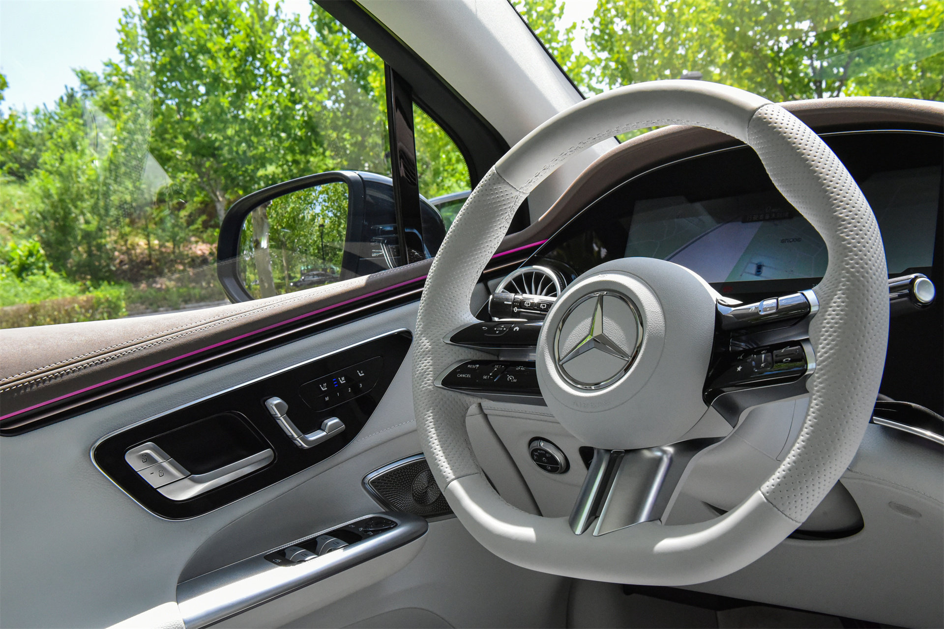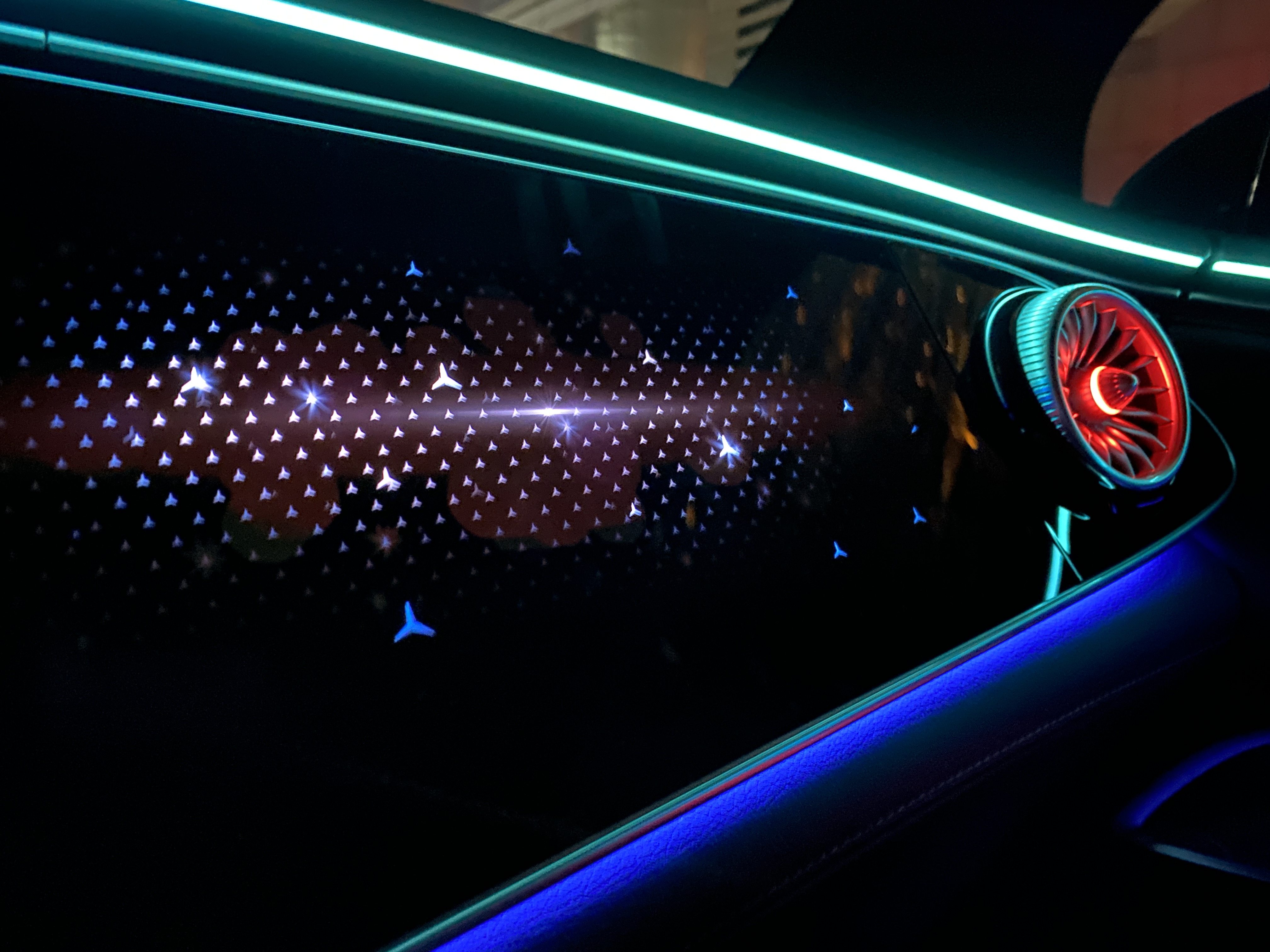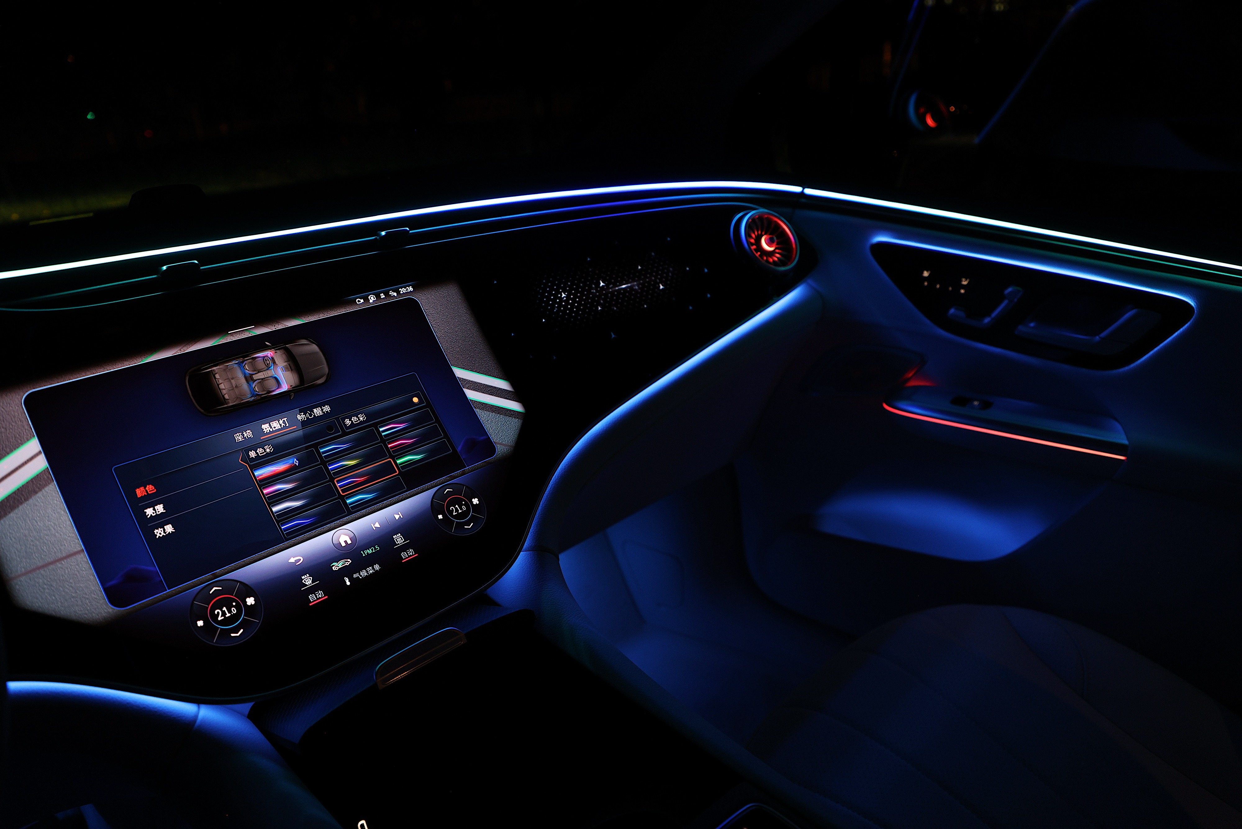 对了,说到内饰,绝对不能不提EQE SUV的氛围灯,窃以为,这是目前这个价位上最漂亮的氛围灯效果,没有之一。具体效果如何?请看下面几张图,所有图均为原图直出,未经任何处理。