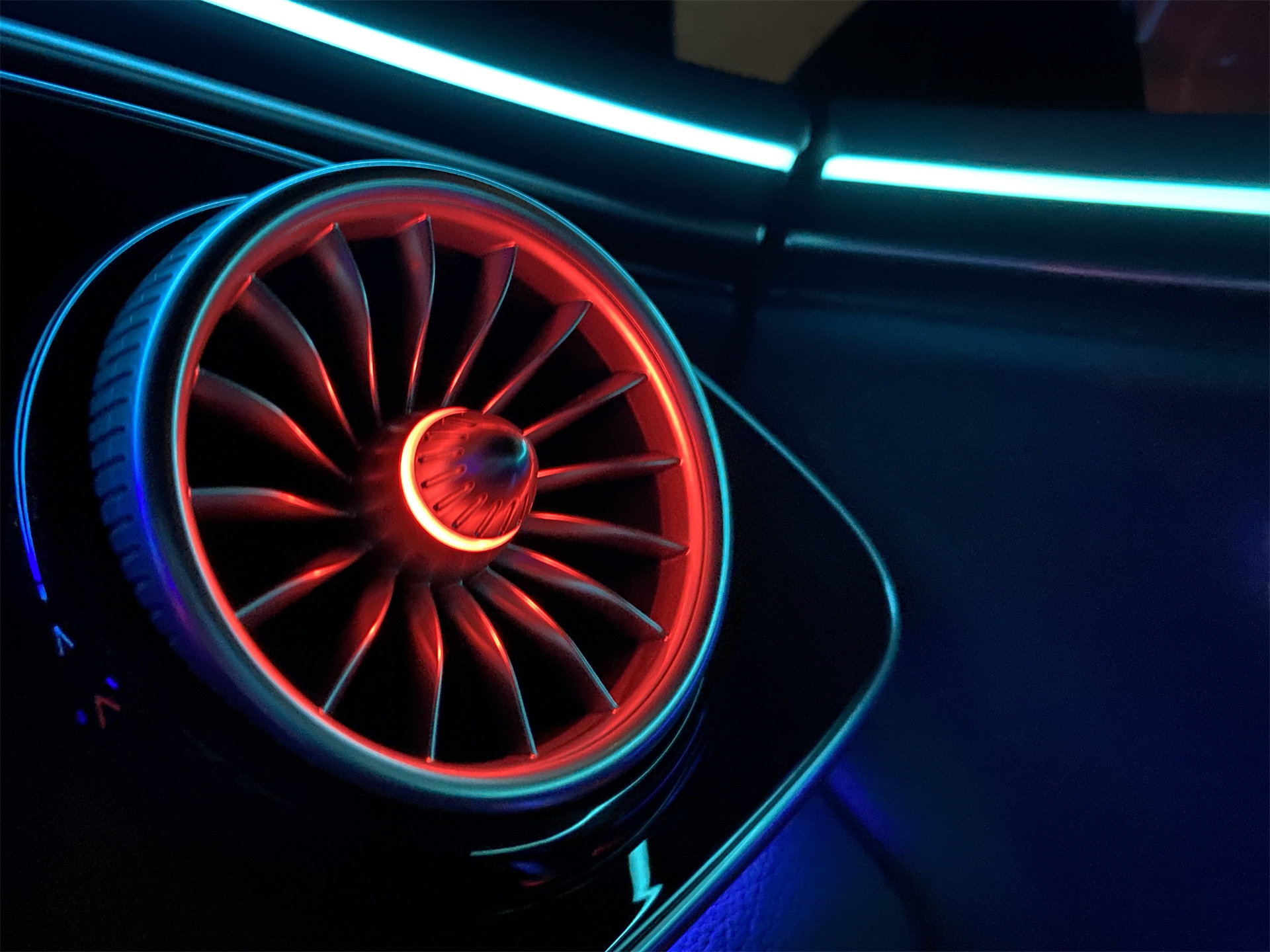 如此棒的氛围灯效果,其实也藏了很多细节。奔驰自己有一套关于每一款车的氛围灯要用多少颗灯珠,每一颗灯珠的亮度应该是多少尼特,乃至什么区域应该如何布置灯带,布置多少长度的灯带的标准。这种标准甚至是细化到一个空调出风口的灯光效果上的,上图那个漂亮的出风口灯效就是个例证。